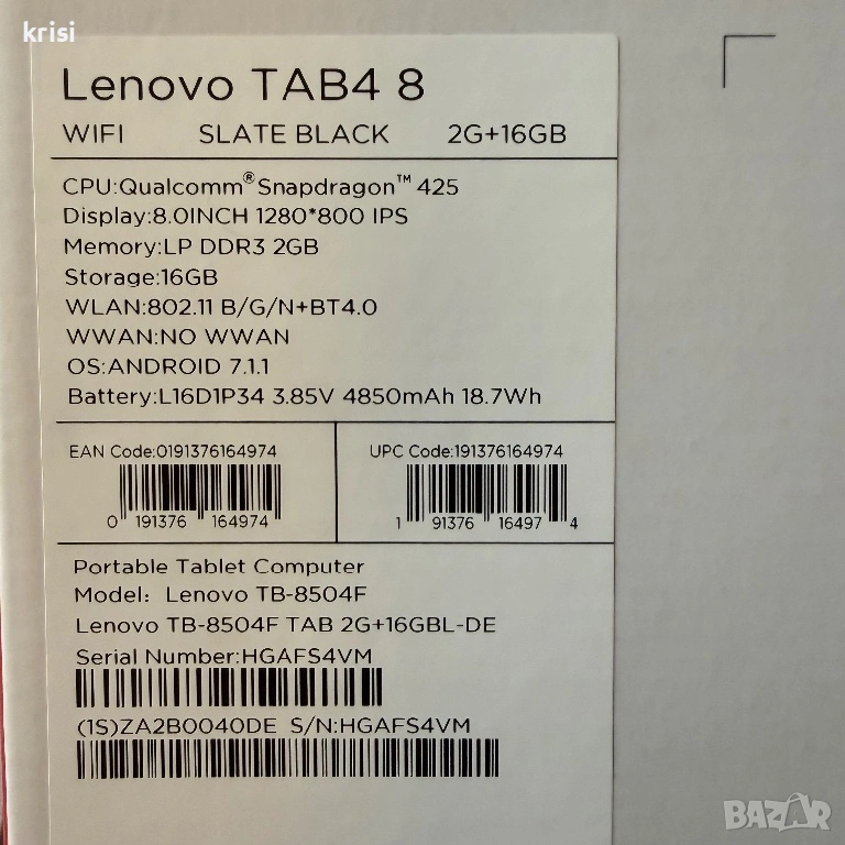 Продавам таблет Lenovo модел Tab 4 с 8 инчов IPS екран. Таблета е с вътрешна памет 16 gb и оперативна 2 gb ddr3. Ips екран с резолюция 1280х800 с голяма 18.7 wH батерия с капацитет 4850mah. Процесорът е Qualcomm Snapdragon 425. Операционна система Android 8.1.2 таблета е със стерео говорители dolby atmos и е подходящ гледане на филми сърфиране и за някой по леки игри подходящ и за деца може да се направи детски профил.