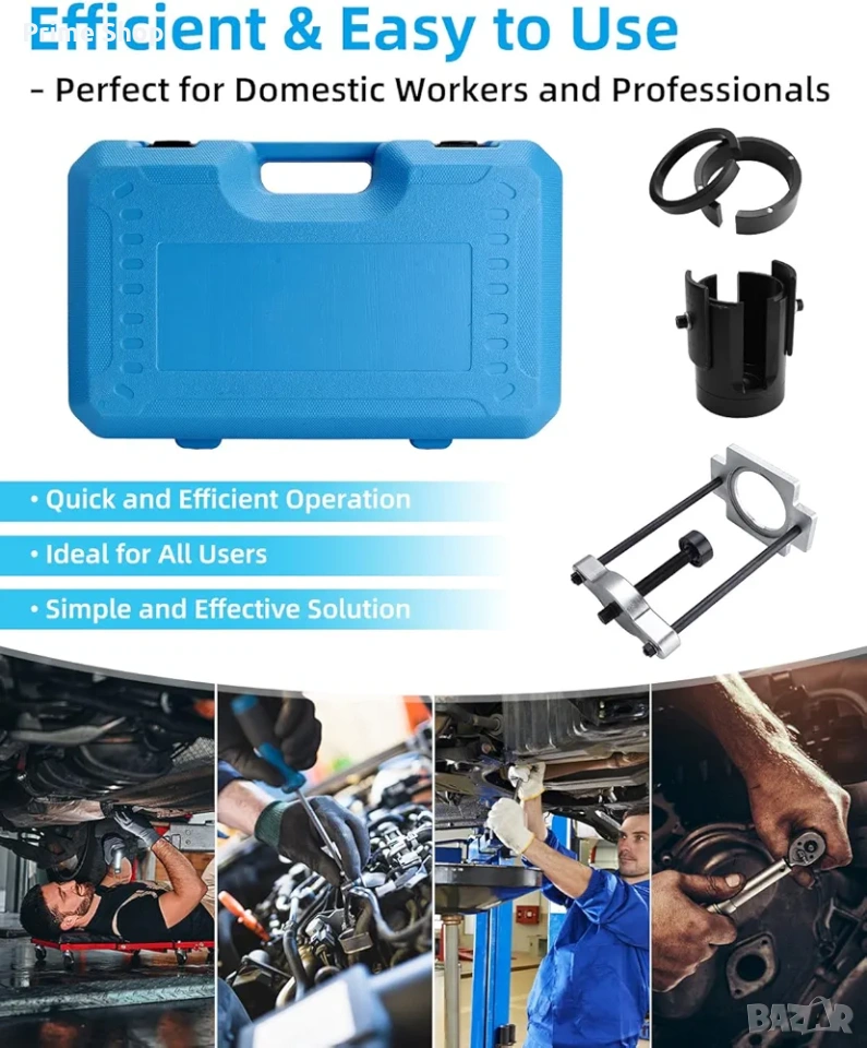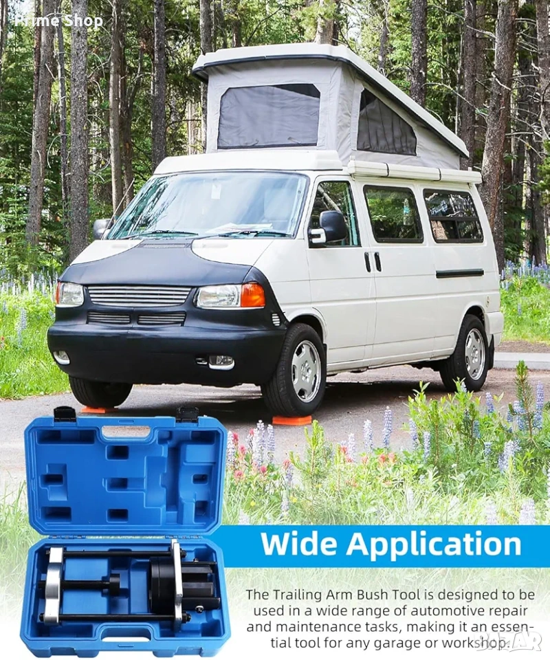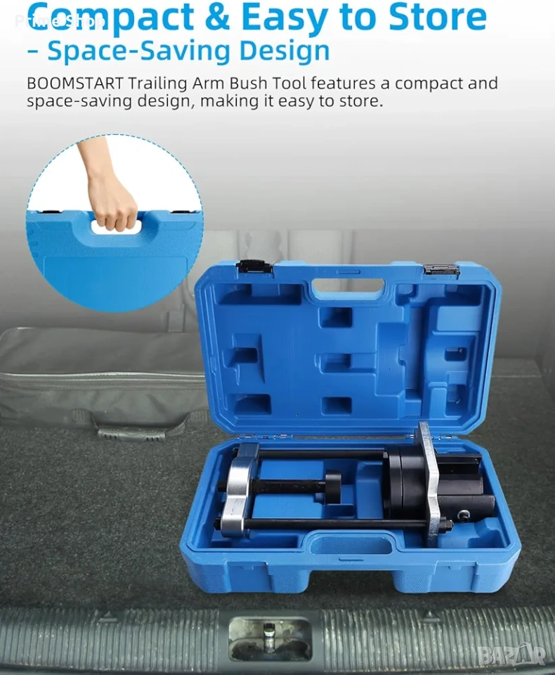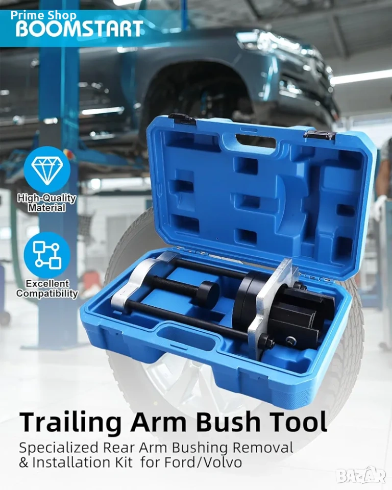 Специализиран комплект инструменти марка BOOMSTART, проектиран за безопасен и ефективен демонтаж и монтаж на тампони на задни носачи (trailing arm bushings). Инструментът е специално разработен за съвместимост с широка гама модели на Ford и Volvo. Основното предимство на този комплект е възможността за работа на място (in-situ) – директно върху превозното средство, без да се налага цялостно демонтиране на носача. Това значително оптимизира работния процес и съкращава времето за ремонт, правейки го идеален избор както за професионални автосервизи, така и за специализирани гаражи.