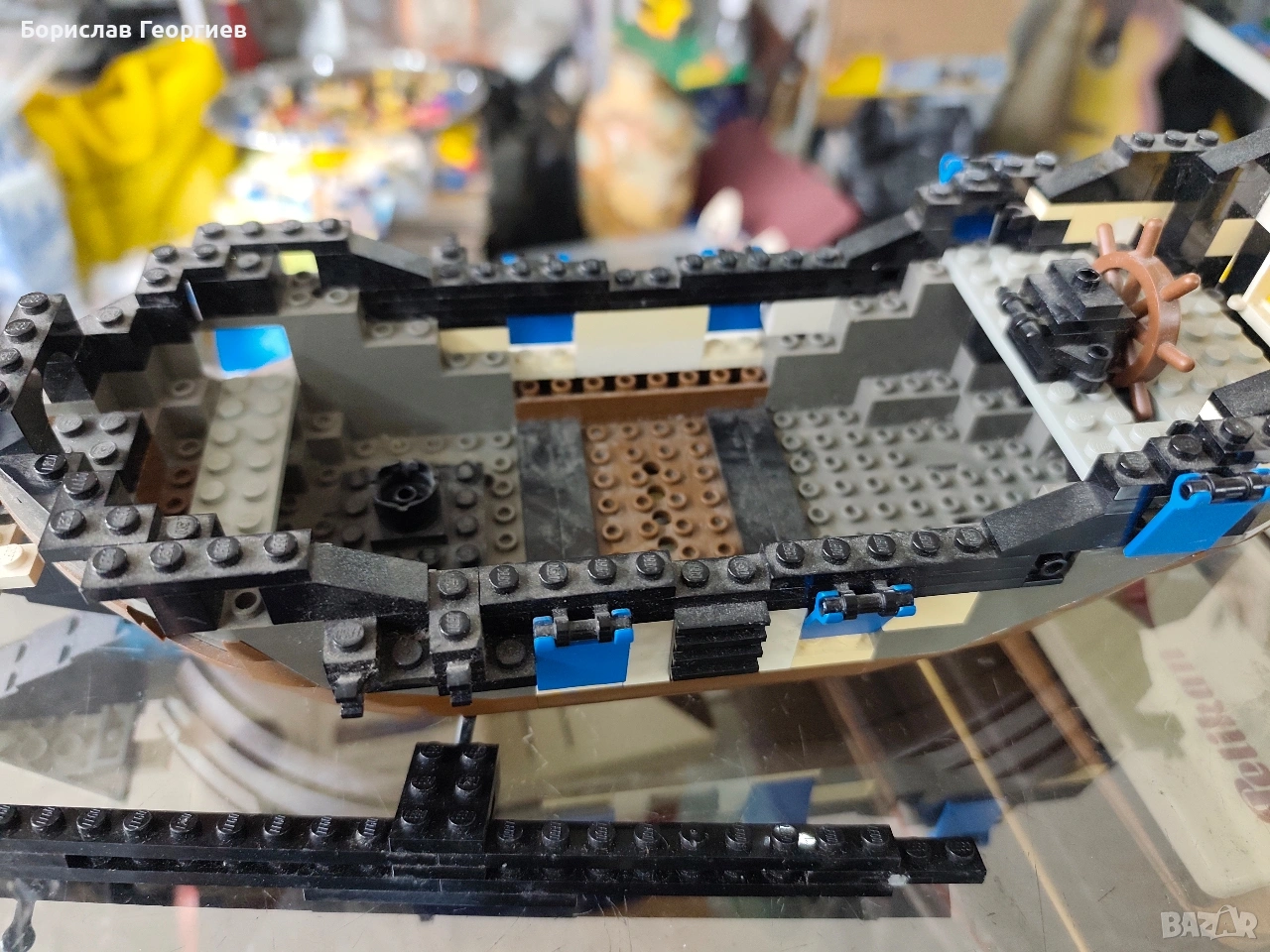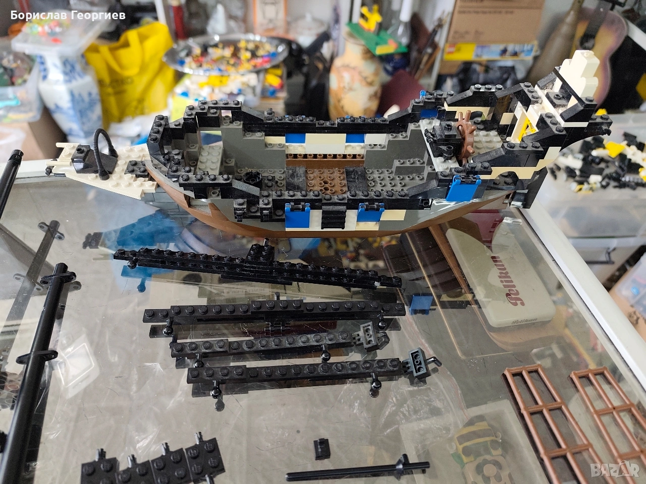 Комплекта е без кутия и книжка.Липсват две пушки,въжето,адмирала,една шапка,платната,колелата и едната основа за топовете,сините пагони и десетина части.На последните две снимки са липсващи части.Частите на кораба са залепени с лепило и не знам да ли ще могат да се махнат.
