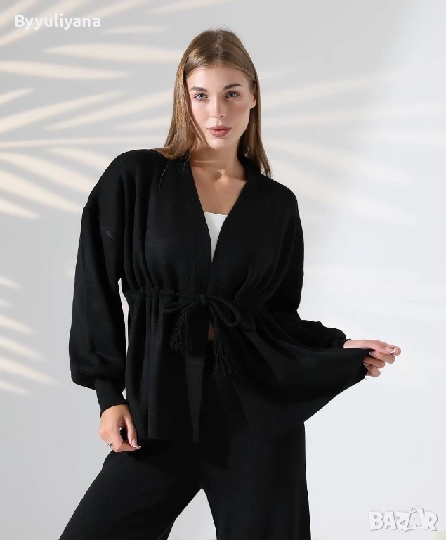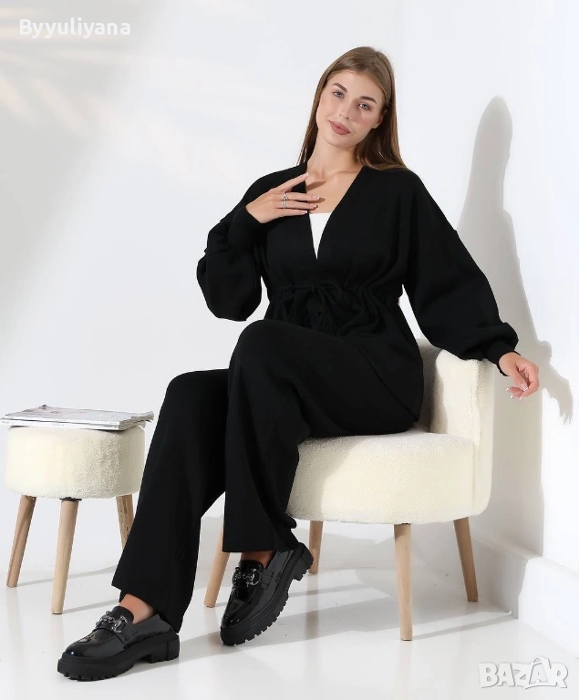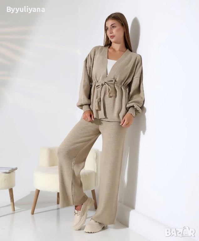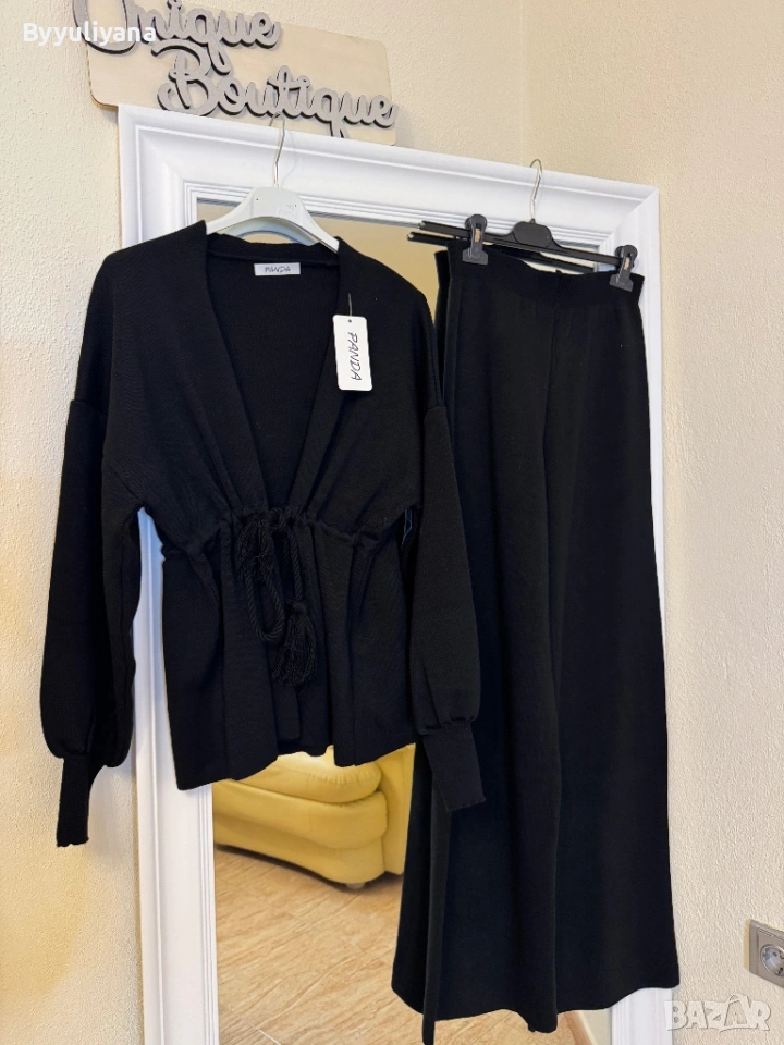 Комплектът е чисто нов. Състои се от две части - широк панталон с висока талия и прав крачол + жилетка с връзки тип въже, която може да се носи самостоятелно или с нещо отдолу