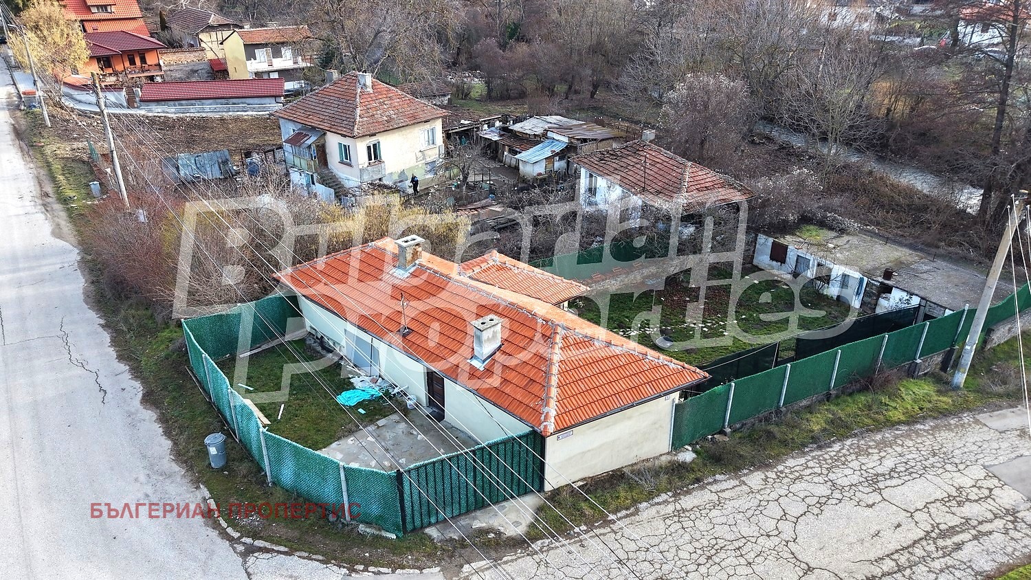 Имотът има две дворни пространства - малък двор от горната страна на къщата, където е основният вход, една част е трева, другата част е бетон и камък, оградата е мрежа тип жив плет и двукрила метална дворна врата за влизане с кола. Големият вътрешен двор е от долната страна на къщата към реката, има каменна, бетонна и тревиста части. Оградата е каменен зид с монтирана върху него висока ограда мрежа тип жив плет към улицата и към съседния двор. В дъното дворът е затворен със селскостопански постройки около 60 кв.м.