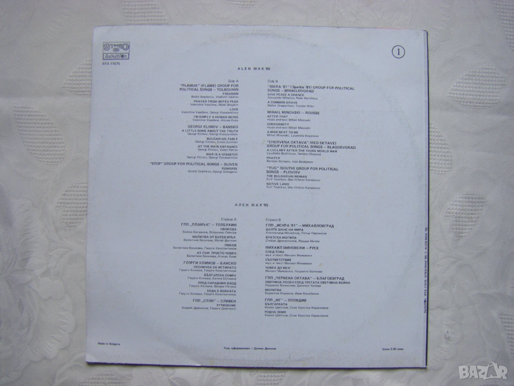 Грамофонна плоча - ВТА 11575 - Фестивал на политическата песен "Ален мак" (1985; Благоевград) - първа плоча