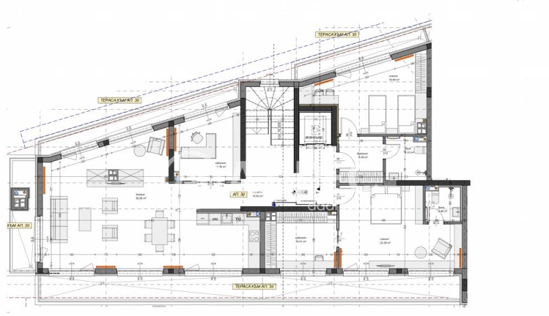 Многостаен апартамент състоящ се от: коридор, просторна дневна с трапезария и кухненски бокс - 57кв. м, две спални, два кабинета, две бани с тоалетна, дрешник, две тераси. Има възможност за закупуване на гараж или паркомясто.
