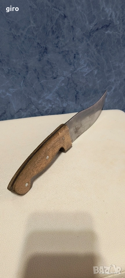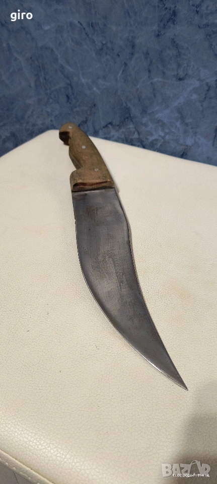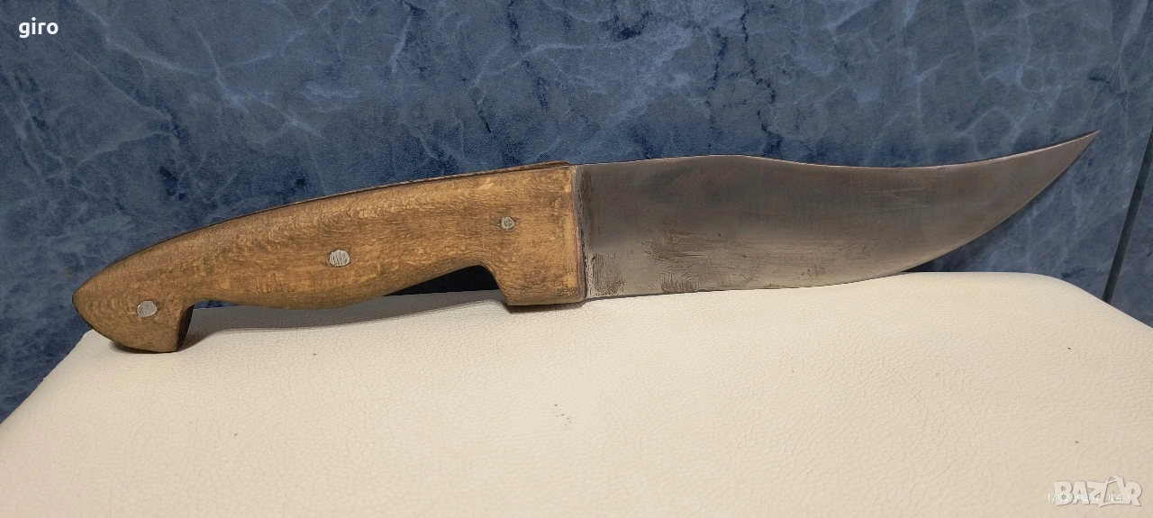 Стар доста голям и масивен ръчно изработен нож с масивно острие от ресорна стомана и масивна качествено изработена дървена дръжка. С характерна извивка на острието като в широката си част е 4,8см. Ножа е доста внушителен с дължина 37см. Перфектен е за сериозна употреба или за украса и декорация.