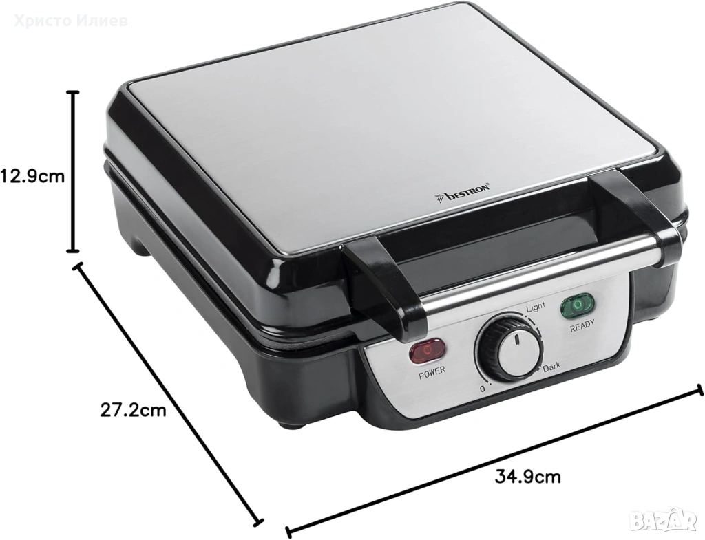 Съдържание на кутията: 1 гофретник Bestron за брюкселски гофрети, дължина на кабела: 73-75 см, мощност: 1100 W, размери: 33 x 24,5 x 10,5 см, тегло: 2,33 кг, материал: неръждаема стомана/пластмаса, цвят: черен, ASW281