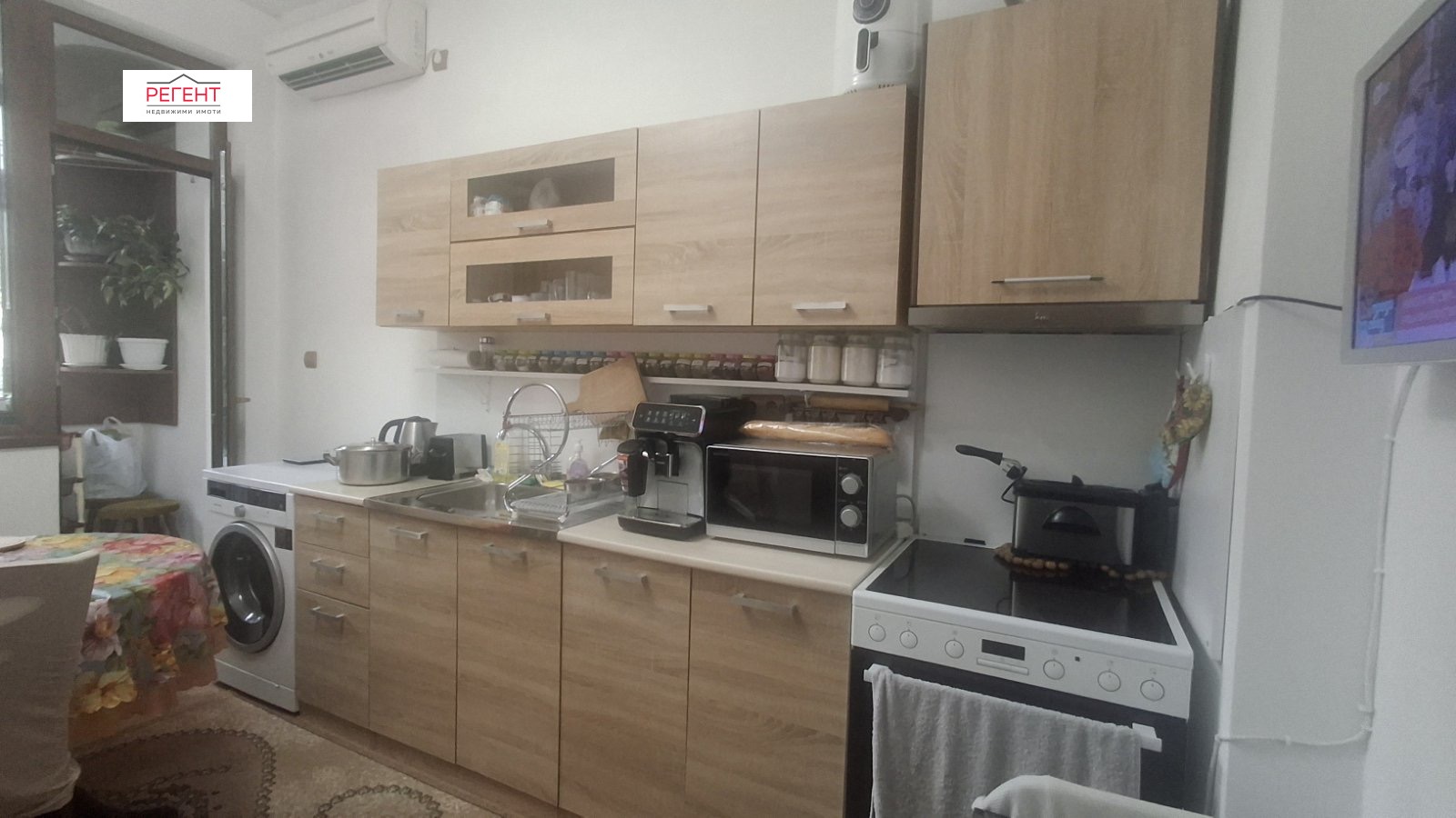Апартаментът е с подменена ел. и ВиК инсталации; подменена дограма; вътрешни и външни интериорни врати от масивно дърво; нови сервизни помещения; външна топлоизилация. Жилището съдържа: входно предверие, кухня, голяма стая; баня с вана; тоалетна. Подовите настилки в стаята и предверието са дъбов паркет и дюшеме /изциклени и лакирани/, теракота в кухнята.