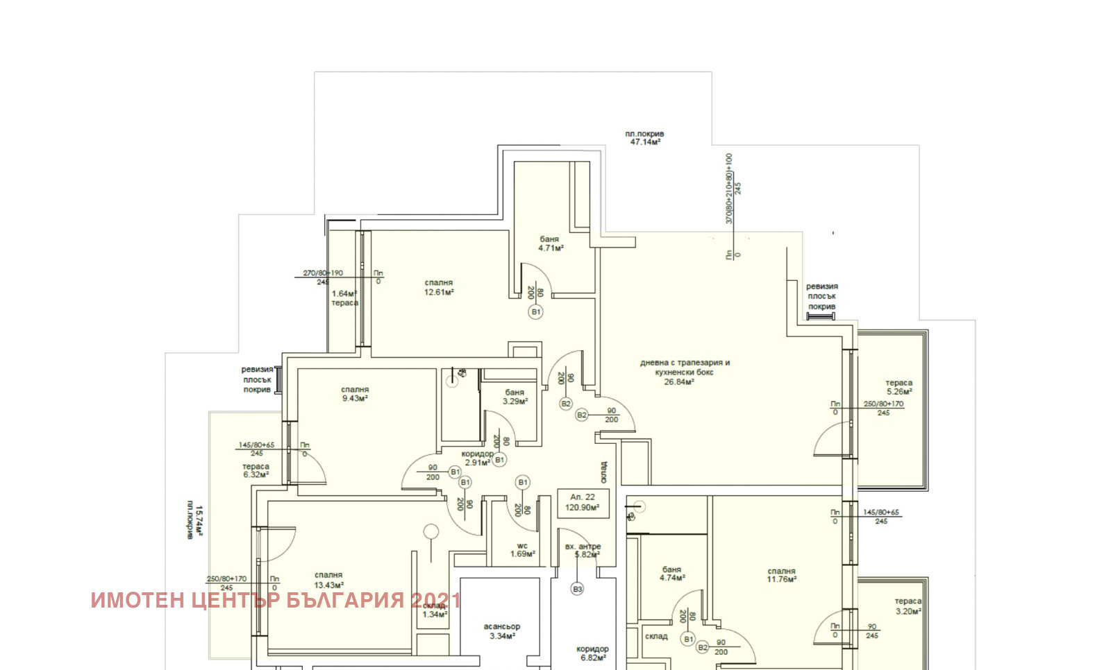 - Апартамента се състои от коридор, дневна с кухненски бокс с излаз на тераса, три спални, две бани с тоалетна и тереса.