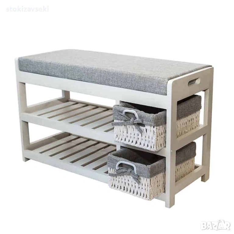 Шкаф-пейка за обувки, с мека възглавничка и две плетени кошници за съхранение.