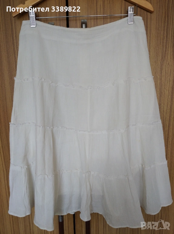 Продавам пола - бял цвят, солей, дължина до коляно 67см, закопчава се с цип, талия едностранно 41см, размерът е приблизителен около L.