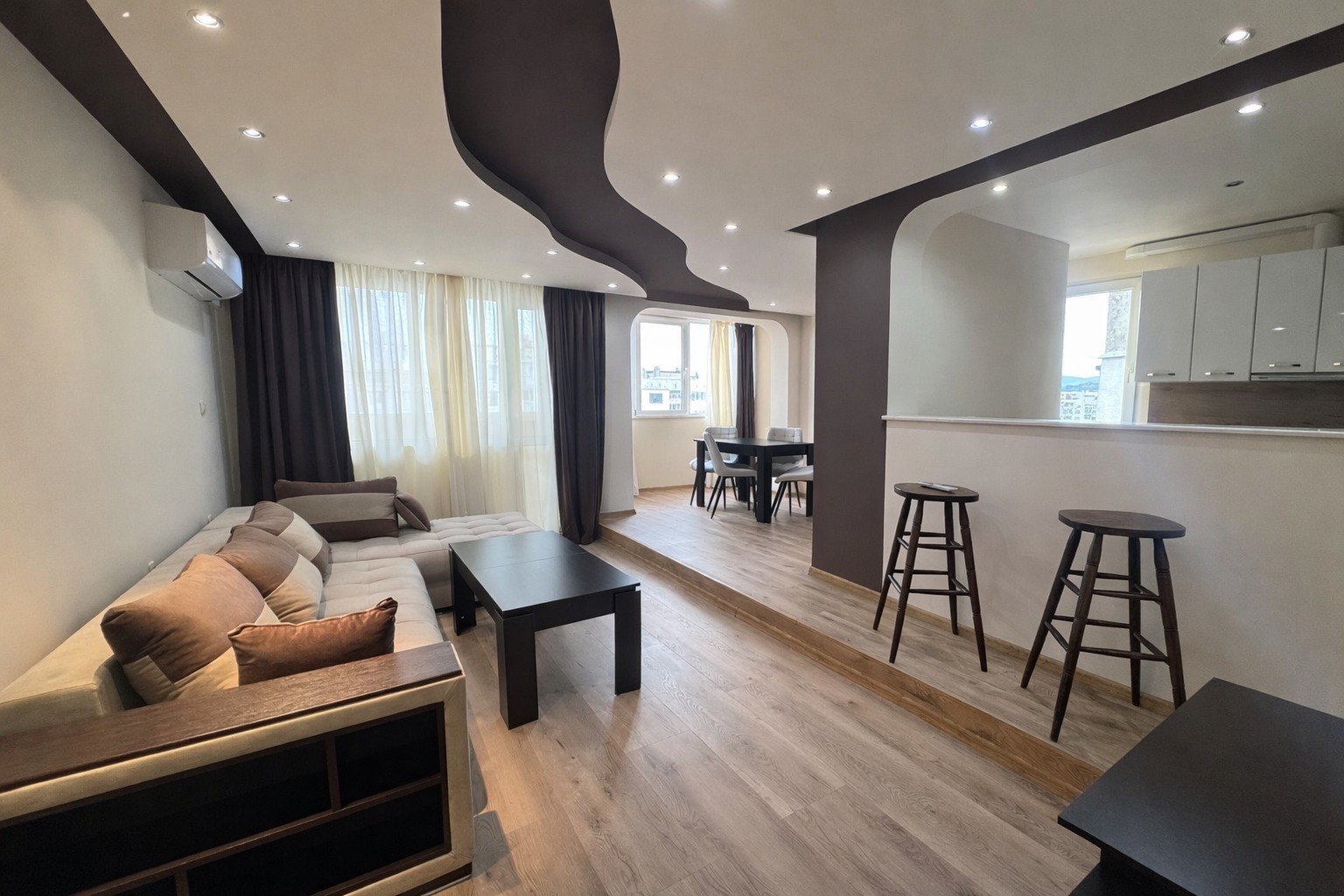 First level: master bedroom (~15 m²), separate kitchenette with a bar, fully furnished with new high-end appliances, living room with dining area (~35 m²)