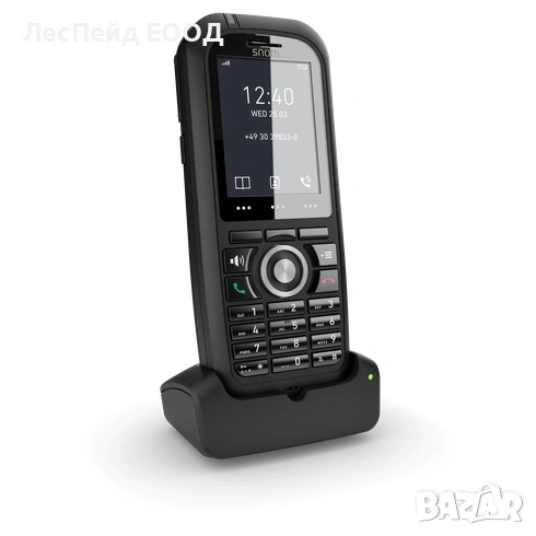 Snom M80 е перфектният универсален телефон за вътрешна и външна употреба. Слушалката е изключително лека и компактна и благодарение на специалното здраво покритие (сертифицирано по IP 65 и MIL-STD 810g) е особено здрава и издръжлива. Това означава, че ултрамодерната слушалка може лесно да издържи на падания до 2 метра и е защитена от пръски вода и прах. Това прави M80 подходящ не само за офиса, но и за по-сложни места като складове, строителни обекти или външни зони, изложени на атмосферни влияния. Компактното устройство, което тежи само 120g, също има интегриран Bluetooth и интегриран BLE таг за мобилен работен ден. Не само че всички широко използвани слушалки могат да бъдат свързани към телефона, но и Snom Bluetooth Beacons отварят напълно нови възможности за приложения. От проследяване на устройствата в реално време до защита от аларми. Допълнителна информация за маяците можете да намерите тук. Този модерен DECT телефон също е съвременен благодарение на своя висококачествен LED цветен дисплей, интегриран Bluetooth, най-добро HD аудио и вибрационна аларма. Освен това има високоефективна презареждаща се батерия, която осигурява до 12 часа време за разговори. Слушалката Snom M80 е модерен, компактен и здрав спътник както за вътрешна, така и за външна употреба в ежедневния бизнес.