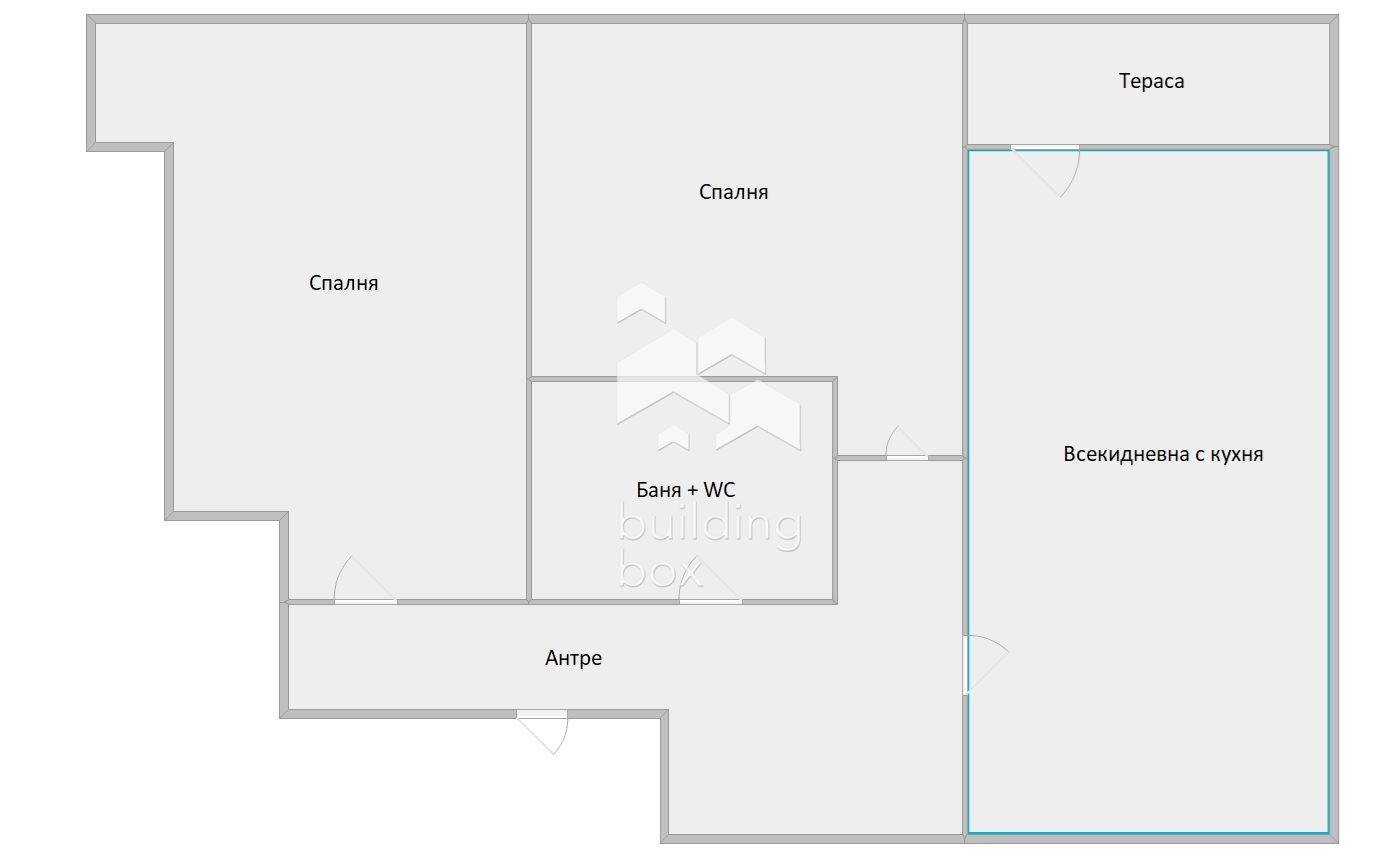 - РАЗПРЕДЕЛЕНИЕ: Състои се от светла всекидневна с кухненска част, две спални, баня и тоалетна, входно антре, тераса.