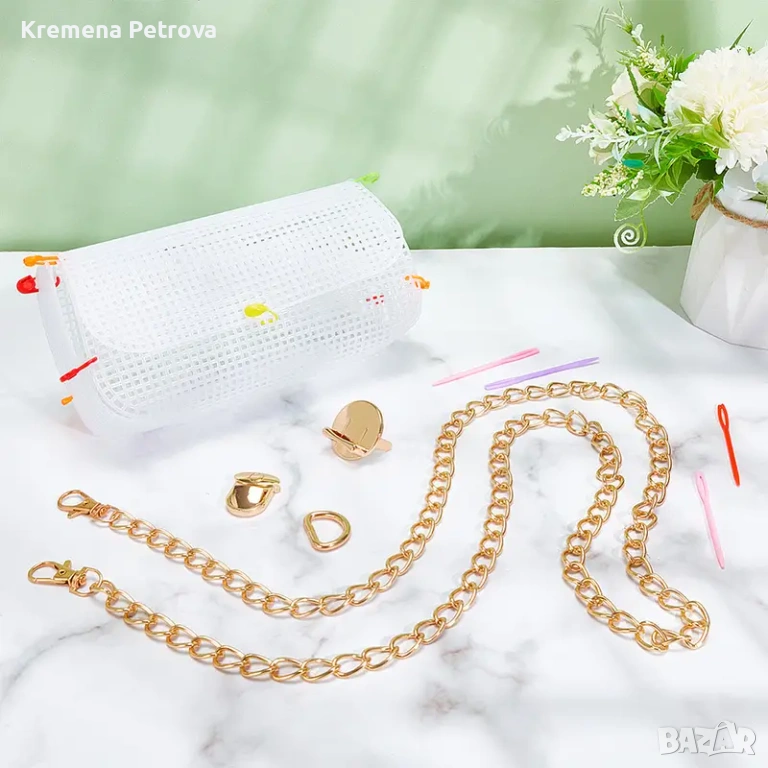 Снимка 9 -11: Нов Комплект за плетене на чанти DIY-Пластмасова платнена торбичка, верижка,ключалка,каишка,игли,маркери, цена 7,00€