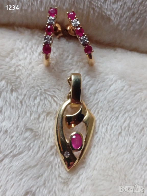 Ръчна изработка от злато 9 карата 2 грама с инкрустирани естествени рубини и диаманти.1,7 см. са и в отлично състояние.Не коментирам цена.Многобси подхождат с медальона.