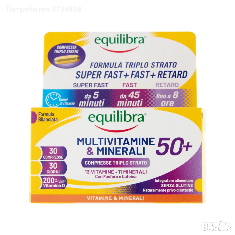 Мултивитамини и минерали 50+ на Equilibra е комплексна формула за балансиране на важни дефицити от витамини и минерали, отчитаща специфичните нужди при възраст над 50 години. Произведени са в трислойни таблетки с иновативна технология за диференцирано освобождаване: