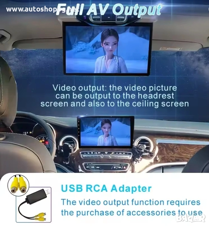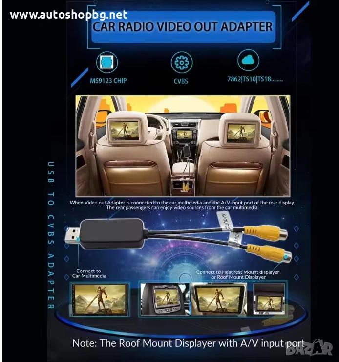 Практичен USB видео адаптер, предназначен за свързване на Android автомобилна мултимедия към подглавникови и таванни монитори. Позволява извеждане на видео сигнал (AV-OUT) към външни екрани чрез RCA изходи.