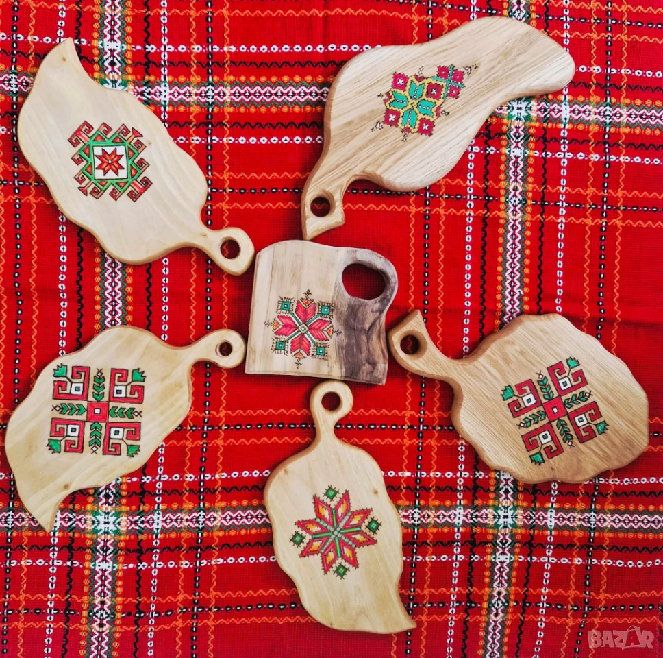 Ръчно изработени орехови дъски с пирография и акрил, вдъхновени от българската шевица.