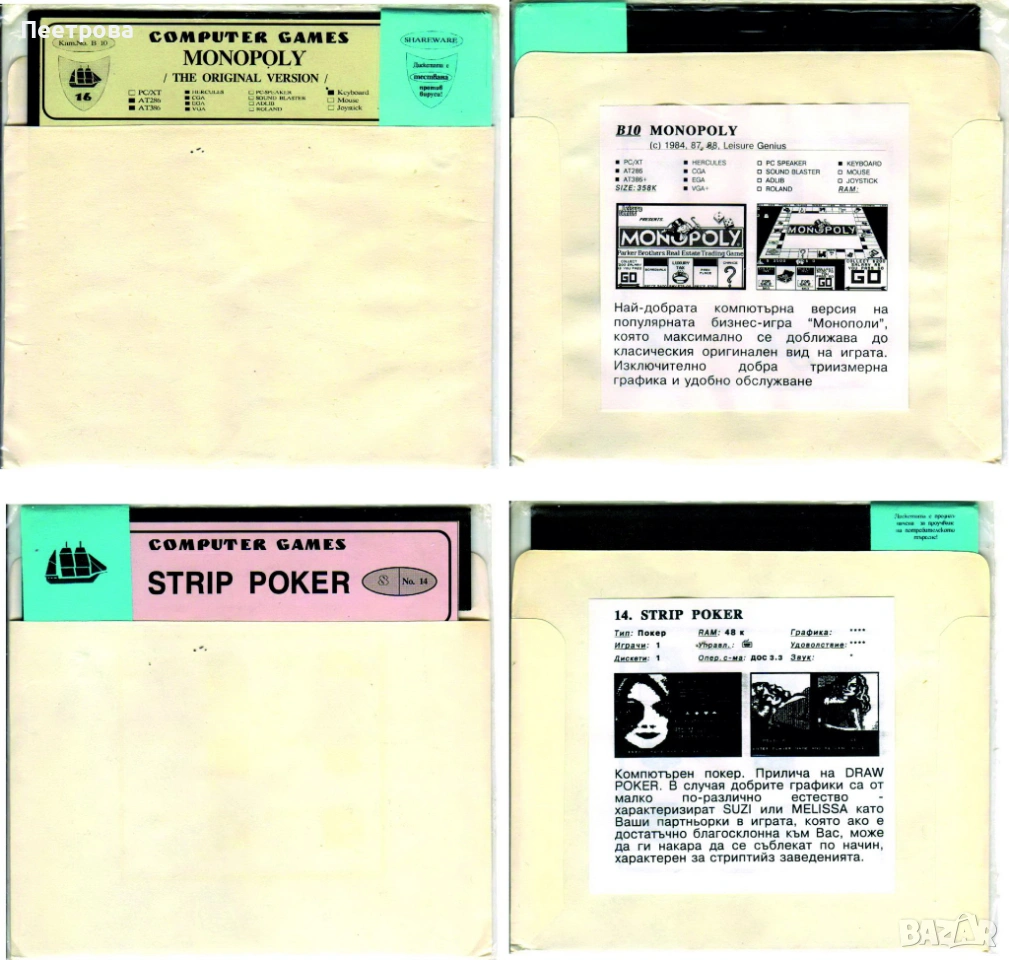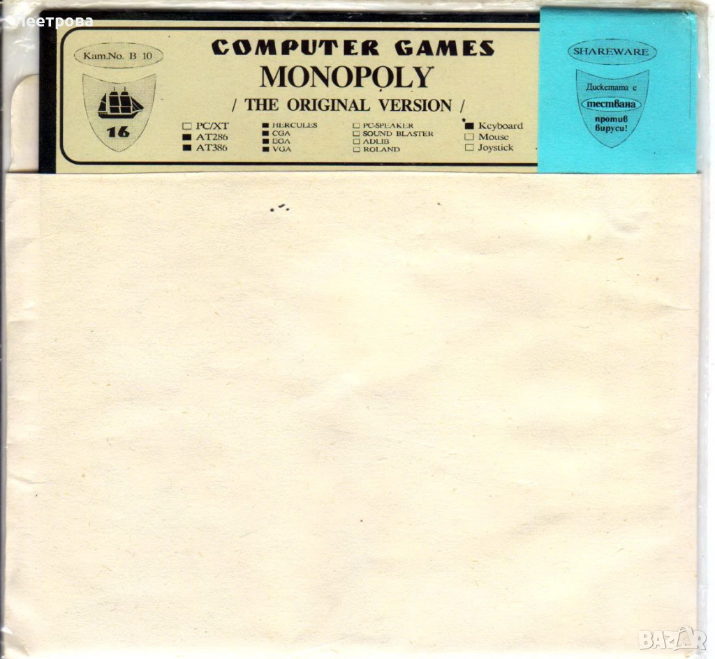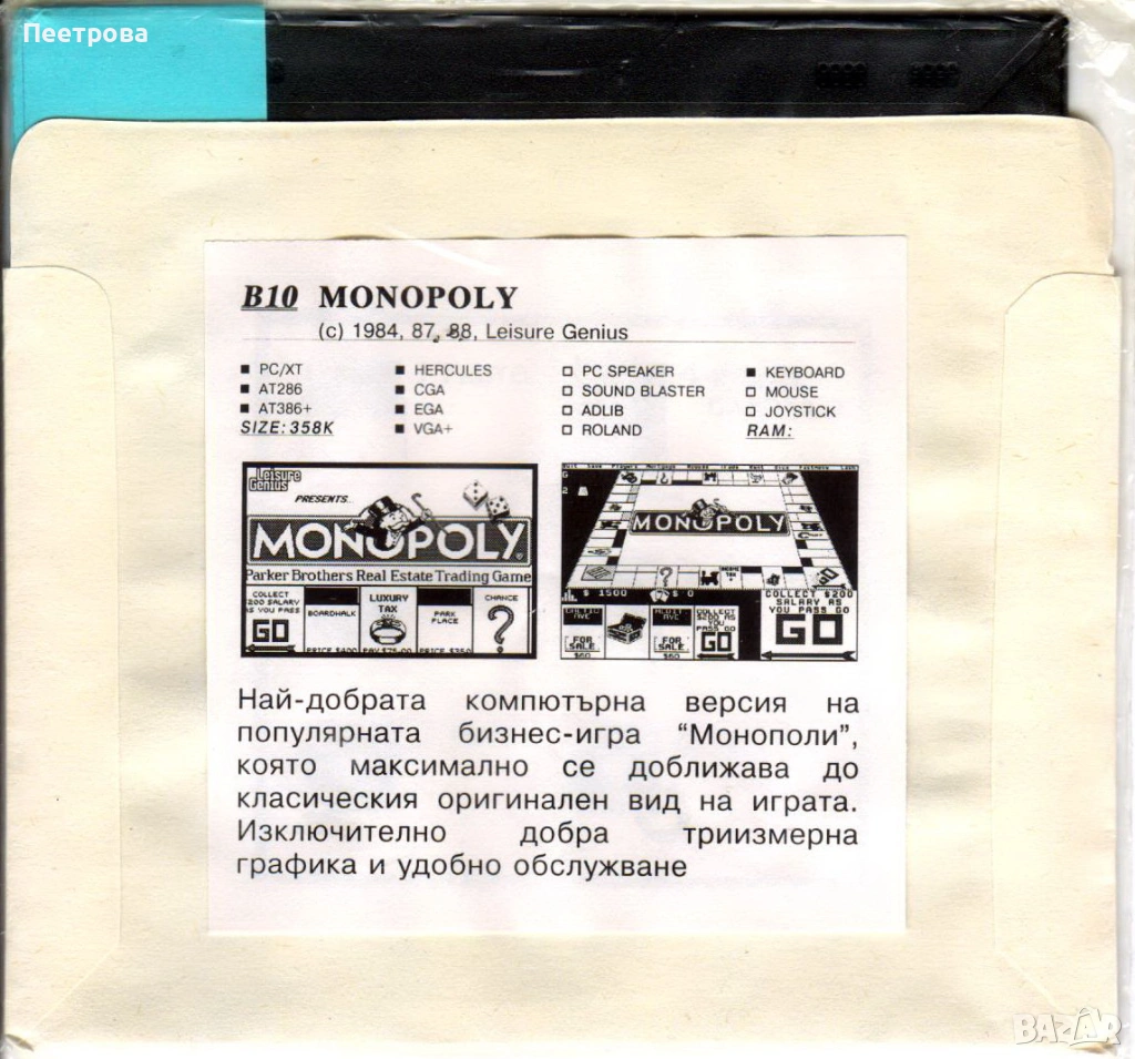 Monopoly: 5.25 инчова дискета с българска версия на компютърната игра , разработена от Leisure Genius в края на 80-те години. Тази конкретна версия, обозначена като "B10 MONOPOLY", е интересна находка от зората на персоналните компютри в България. Разработчик и издател: Оригиналната игра е дело на британското студио Leisure Genius (част от Virgin Games), което е притежавало лиценза за компютърни адаптации на настолните игри на Parker Brothers през 80-те. Предназначена е за стари компютърни системи като PC/XT и AT286/386. Поддържа графични режими като CGA, EGA и VGA. Дискетата е маркирана като тествана против вируси. Играта е съвместима с компютри PC/XT, AT286 и AT386. Графични режими: Поддържа стандартните за времето си видео адаптери: Hercules, CGA, EGA и VGA. Звукова поддръжка: Включва опции за PC-Speaker, Sound Blaster, Adlib и Roland. Управление: Може да се играе с клавиатура, мишка или джойстик. Играта е обозначена като „The Original Version“ (Оригиналната версия). Позволявала е игра от 2 до 8 играчи, като е имало възможност да се играе срещу компютъра като „майстор на стратегията“.