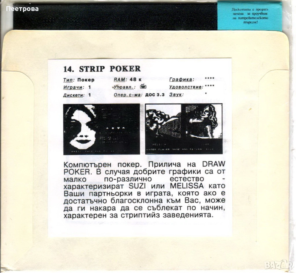 Strip Poker: българско издание на класическата видеоигра (известна още като Strip Poker: A Sizzling Game of Chance), първоначално издадена от Artworx през 1982 г. Тази конкретна версия често е описвана като "игра на късмета" в която играчът се изправя срещу компютърни опоненти (например персонажи като Сузи или Мелиса). Това е една от първите комерсиални графични игри от този тип за домашни компютри. Представлява компютърен вариант на покера с 5 карти (Draw Poker). Играчът залага виртуални пари срещу компютърен опонент, като целта е опонентът да загуби дрехите си при загуба на определена сума. Технически спецификации: RAM памет: Изисква 48 K, Операционна система: Apple DOS 3.3. Предназначена за компютри от серията Apple II (или българските им аналози от серията „Правец“).