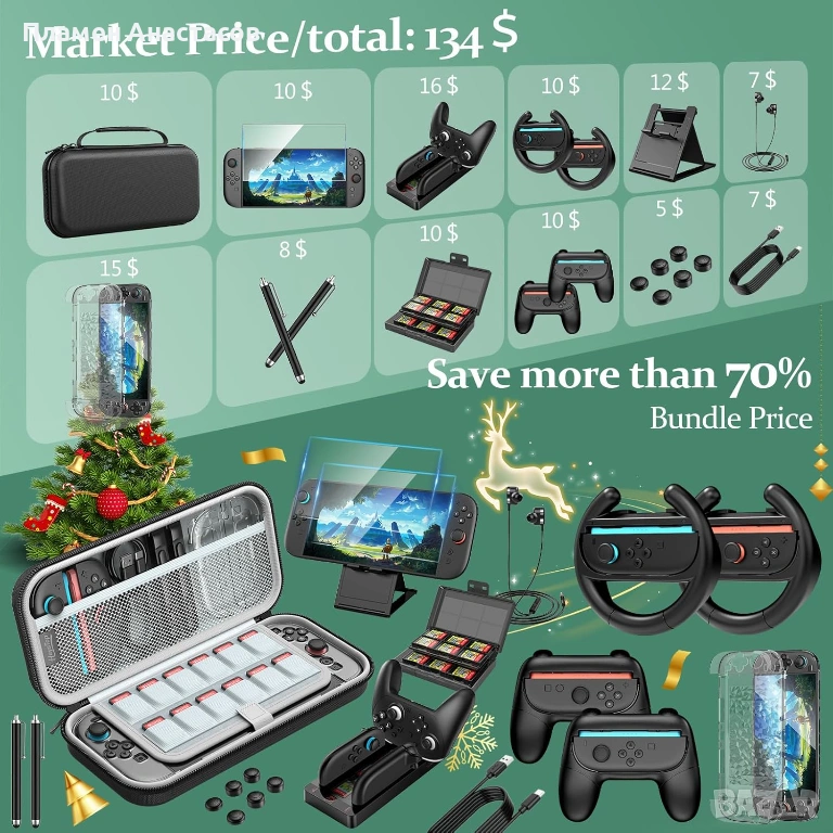За по-добро гейминг изживяване комплектът предлага волани за Joy-Con (racing wheels) за състезателни игри, Joy-Con grip държачи за по-удобен захват, както и thumb caps за по-добър контрол върху стиковете. Включени са и 2 броя закалени протектори за екрана, стилуси за тъч управление и комплекти за почистване.