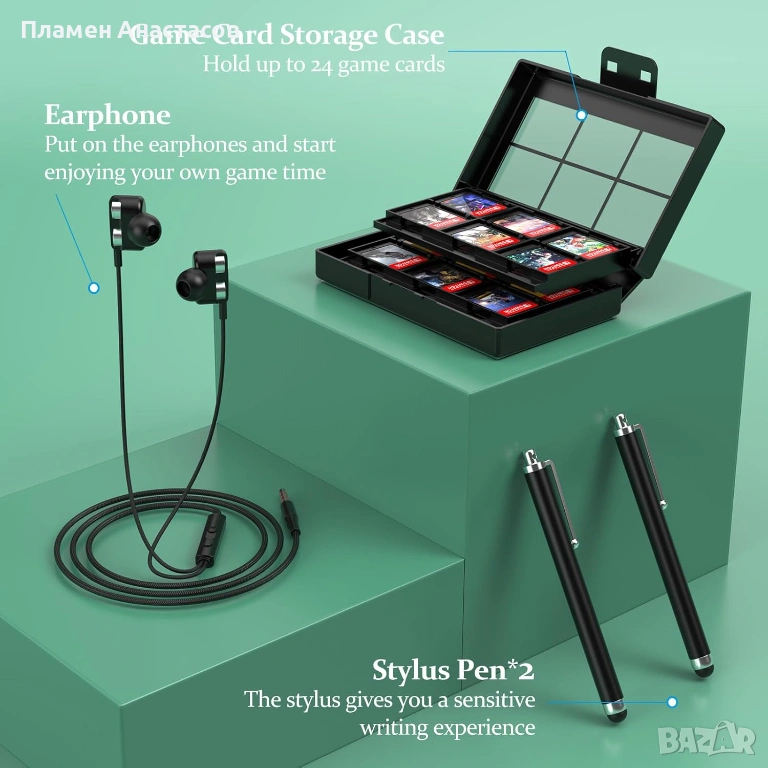 Допълнително получавате зарядна станция за Joy-Con контролери, която позволява зареждане на няколко контролера едновременно, както и стойка за конзолата с регулируем ъгъл за по-комфортна игра. Комплектът включва още слушалки и аксесоари за съхранение на игри.