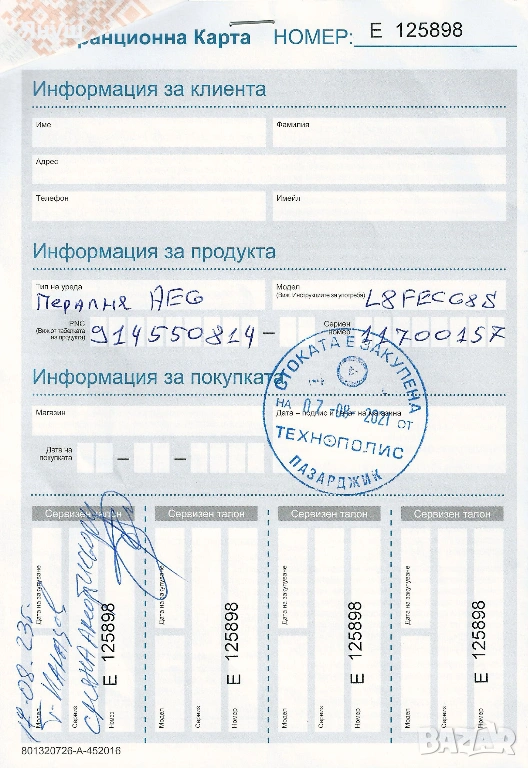 Пералнята е закупена от Технополис на 07.08.2021г., като е с 5г.