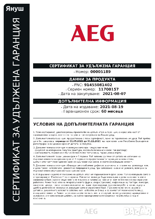 удължена пълна гаранция на производителя, валидна до 07.08.2026г. Инверторният