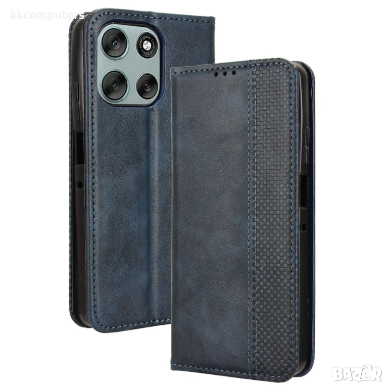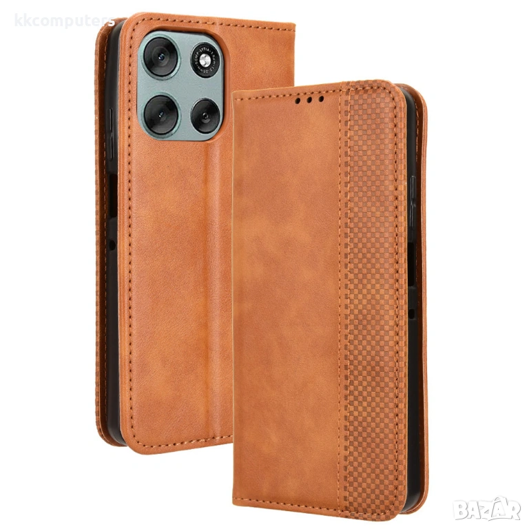 Коженият флип калъф-портфейл за Motorola Moto G56 5G съчетава ретро елегантност с модерна функционалност. Изработен от PU кожа с ретро ефект с характерна мозайка по рамката и здрава TPU основа, този калъф предлага цялостно решение за защита, организация и комфорт. Той включва сгъваема стойка, удобни слотове за карти, както и магнит за автоматично затваряне. Комплектът идва с включен скрийн протектор за пълна защита на екрана.
