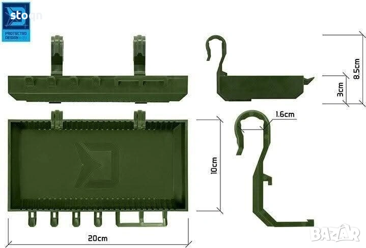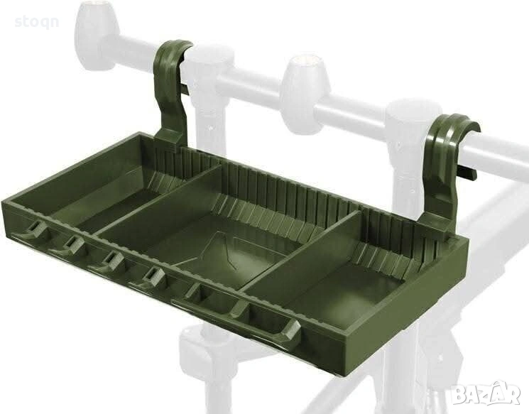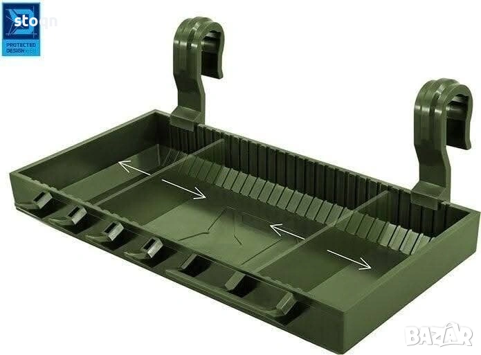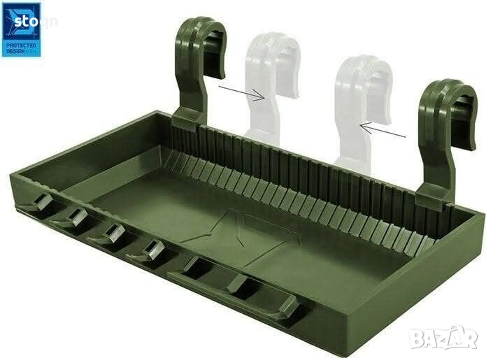 • Лесен монтаж и преносимост: Две здрави пластмасови куки улесняват закачането на рафта върху държача. Куките са отделящи се, което позволява рафтът да бъде пренесен до бивака или поставен на маса.
