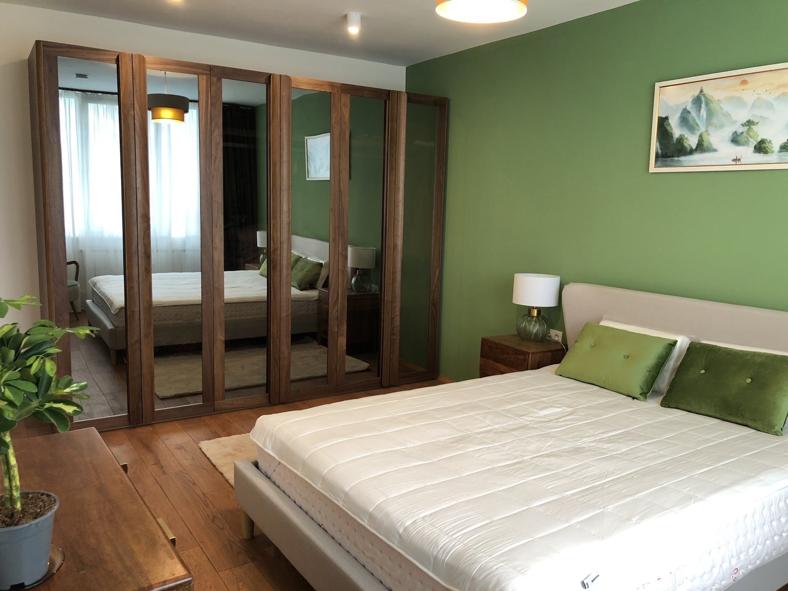 Тристаен апартамент с южно изложение и Панорама към Витоша . В непосредствена близост до The mall и бъдеща метростанция . Всекидневна с кухненски бокс , спалня , кабинет (втора спалня), Баня с тоалетна , остъклен балкон . Складово помещение . Апартамента е след основен ремонт и обзавеждане в стил Mid-Century Modern с високочачествени мебели внос от чужбина.