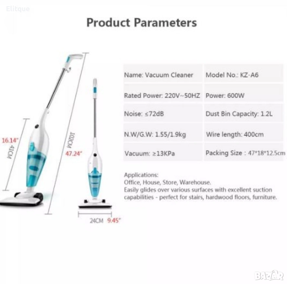 Компактната прахосмукачка 2-B-1 е оборудвана с филтър, който осигурява чист въздух, премахва малките прахови частици, които са невидими с просто око, но се намират във въздуха. Особеността на такива частици е, че те се установяват в белите дробове, с вграден филтър, въздухът във вашия душ винаги ще бъде чист. А наличието на една допълнителна дюза ще ви позволи да почистите труднодостъпни места. Характеристика: · Благодарение на малките си размери, прахосмукачката с миещ се филтър може лесно да достигне дори до проблемни места в апартамента; · Комбинацията 2 в 1 ви позволява да използвате прахосмукачката без основната четка, лесно се използва като ръчна прахосмукачка. С помощта на такова компактно устройство можете лесно да почиствате ъгли и цокли, както и тапицерия на мебели; · Прахосмукачката е снабдена с набор от подвижни накрайници, които могат лесно да се комбинират. С тяхна помощ можете да почиствате както меки, така и твърди повърхности, като: плочки в кухнята или в банята. Наличието на допълнителни дюзи позволява почистване на доста високи повърхности; · В прахосмукачката е вграден модерен Nera филтър, който допринася за по-щателното обезпрашаване; · Четката, която е включена в комплекта на този модел прахосмукачка, контактува доста добре с повърхността на пода, като по този начин абсорбира малки прашинки и прахови частици; · Контейнерът, в който се събира прахта, както и самият филтър могат лесно да се отстранят и почистят от натрупаните отпадъци и прах. За да почистите прахоуловителя, просто го изплакнете с вода. · Дължината на кабела на вертикалната прахосмукачка е 4 метра, което ви позволява да почистите цяла стая без да местите и да включвате прахосмукачката към по-близък контакт. Характеристики: Размер на прахосмукачката: 51х15х15 см; Мощност на прахосмукачката: 600 W; Всмукателна мощност: 120 W; Ниво на шум: по-малко от 70 dB; Обем на прахоуловителя: 1.2 л.; Тегло: 1,5 кг; Захранване: 220 V, 50Hz;