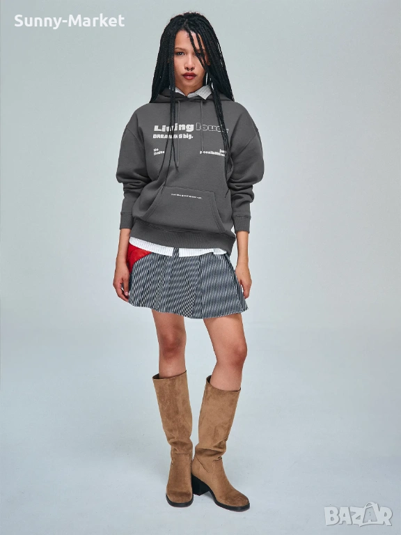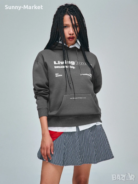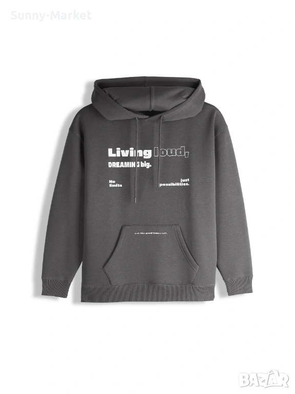 Детайли: с качулка, през главата, с джоб тип кенгуру, с надпис