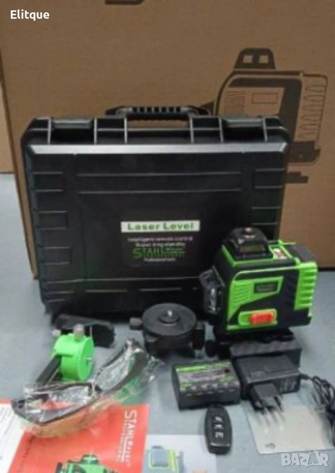 4D Лазерен Нивелир с 16 Линии (Четири Точков), Самонивелиращ се, със Зелен Лазер ХАРАКТЕРИСТИКИ: 6 линии, 4 равнини (4 лазера) Тринога - от 30см до 1 метър Осигуряват прецизно нивелиране и измерване във всички посоки. Степен на защита: IP54 Влагоустойчив и прахоустойчив, подходящ за работа в различни условия. Батерия: 3.6V 5000mAh (литиево йонна) Дълго време за работа до 16 часа без прекъсване. Размери: 130 мм / 80 мм / 135 мм Компактен и удобен за транспортиране и съхранение. Точност: 1 мм при 7 м Висока прецизност при измерванията. Време на работа: 12-16 часа Достатъчно за дълги работни дни без нужда от често зареждане. Работен обхват: 35 м Голям обхват на измерване за различни приложения. Възможност за включване и изключване на линиите поотделно Управление от нивелира или чрез дистанционно. Възможност за работа с адаптер При изтощение на батериите може да продължи работа с адаптер. Работен обхват: 3 градуса При по-голям ъгъл нивелира издава звуков сигнал за невъзможност за нивелиране. Изключване на алармата и заключване на лазерния лъч При необходимост от линия, която да не бъде нивелирана, а под някакъв градус. КОМПЛЕКТЪТ ВКЛЮЧВА: Лазерен нивелир Две батерии Стойка за повдигане от под (разтягаща се тринога) Магнитна стойка за стена Метална планка Стойка за повдигане от под (разтягаща се) Трипод Зарядно Дистанционно управление Текстилна чанта с цип за съхранение Този 4D лазерен нивелир е идеалният инструмент за професионалисти и ентусиасти, които се нуждаят от прецизност и надеждност при всякакви условия. С дългото време на работа, големия обхват и разнообразните опции за монтаж, той е подходящ за широк спектър от приложения