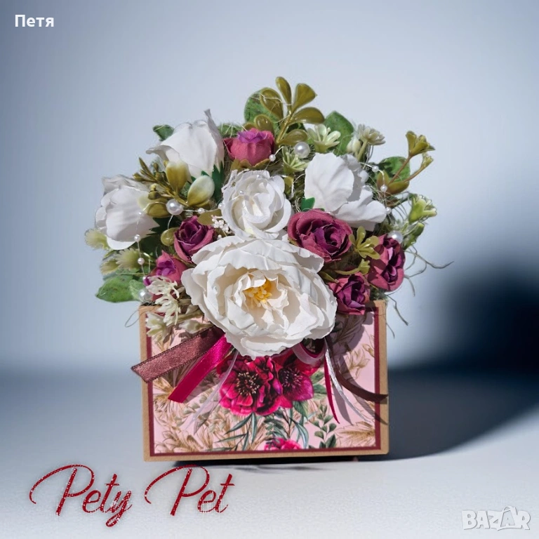 Ръчно изработена кутия - картон и дизайнерска хартия, и изкуствени цветя. Приблизителен размер 20/13см. Отзад джоб за пожелания или пари.