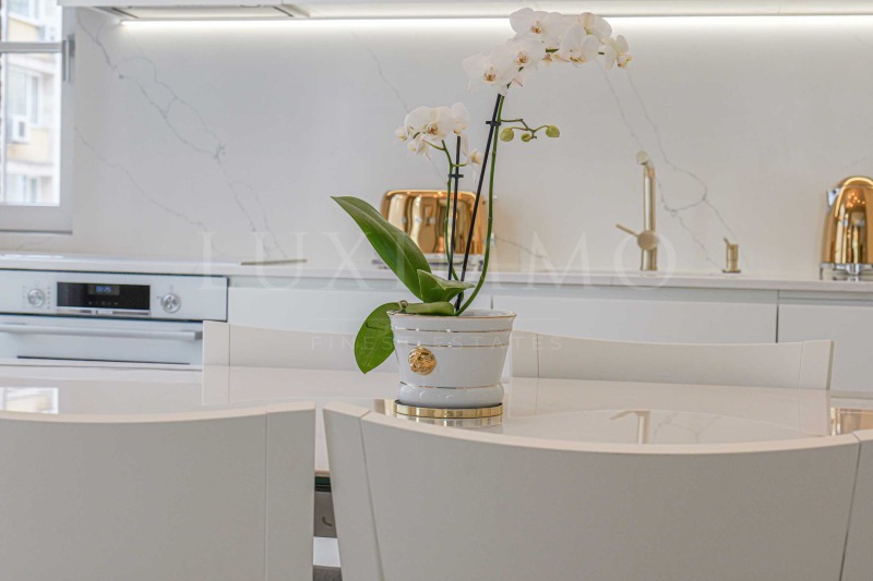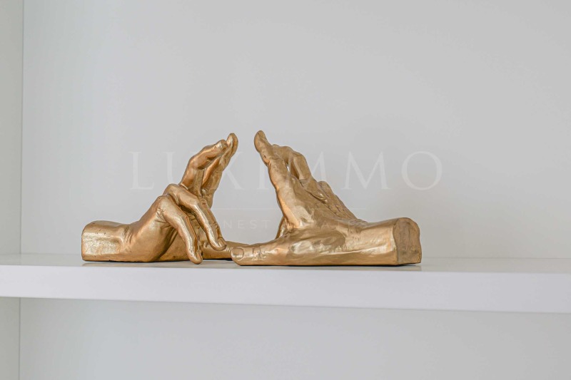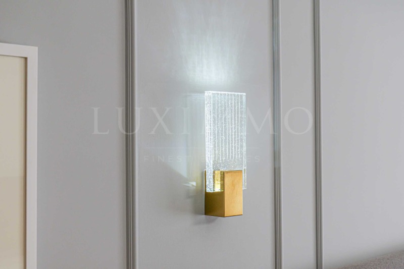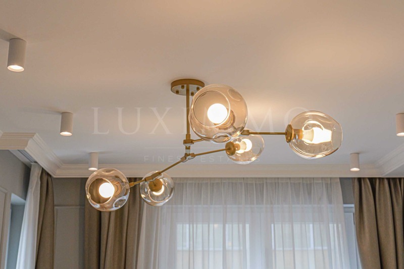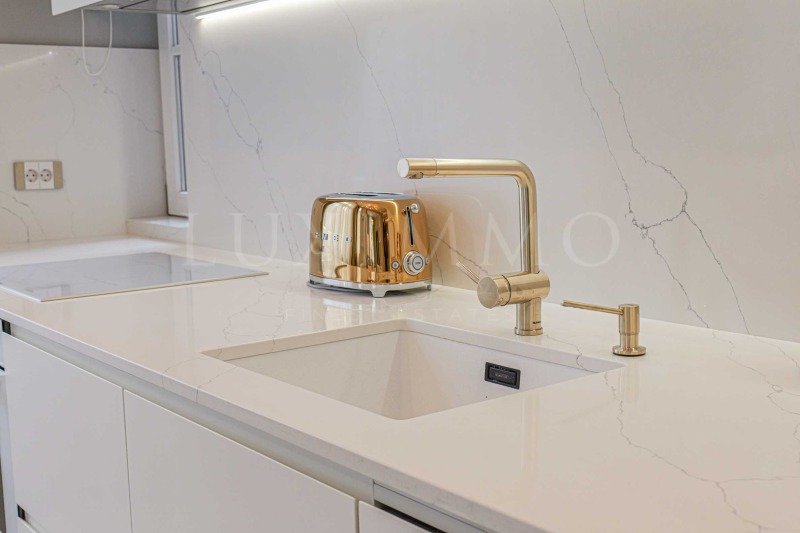 Всекидневната е просторна с монтирана поръчкова кухня, обурудвана с висок клас електроуреди BOCSH и всичко необходимо за удобството на бъдещите наематели. Масата за хранене и кътът с мека мебел са красиво съчетани. Двете спалните са светли и просторни, като родителската е с дрешник , тераса и собствена баня. Имотът разполага с още една модерна баня с тоалетна. В коридора има гардероб, а в ниша е поместена пералня и сушилня BOCSH. Настилките на пода са изцяло естествени - камък орехов паркет тип дюшеме. Банята е облицована с италиански гранит, а смесителите и аксесоарите са с позлатено покритие.