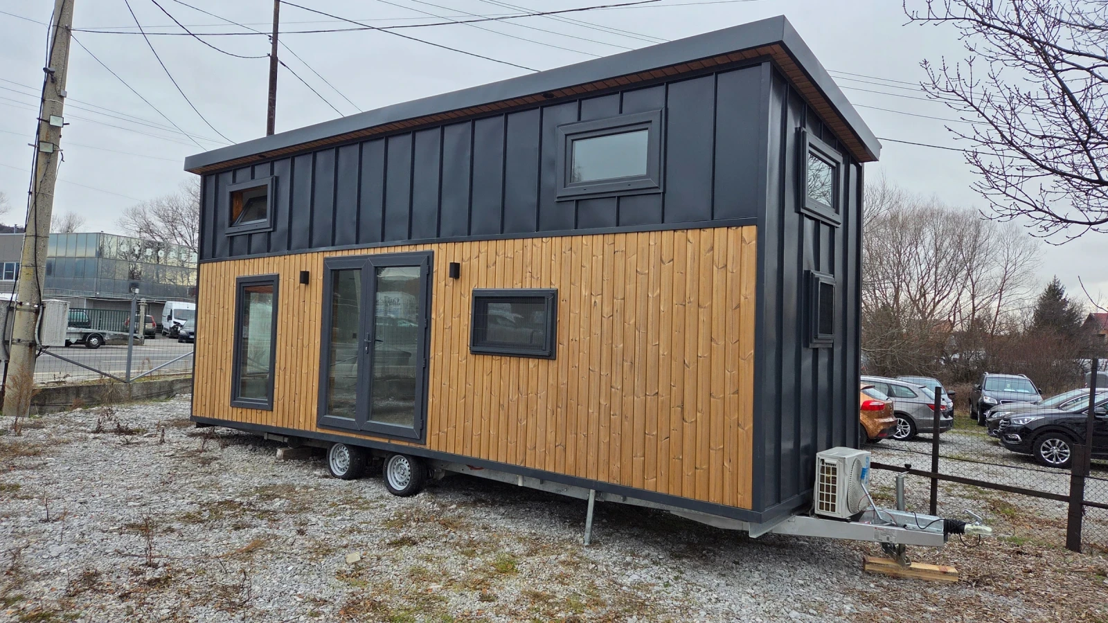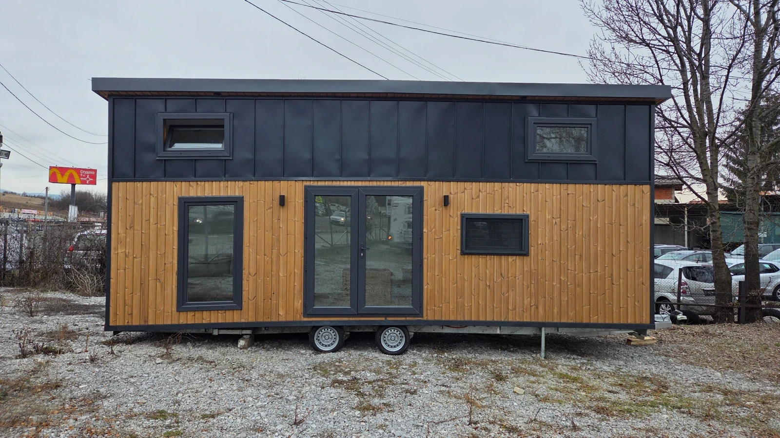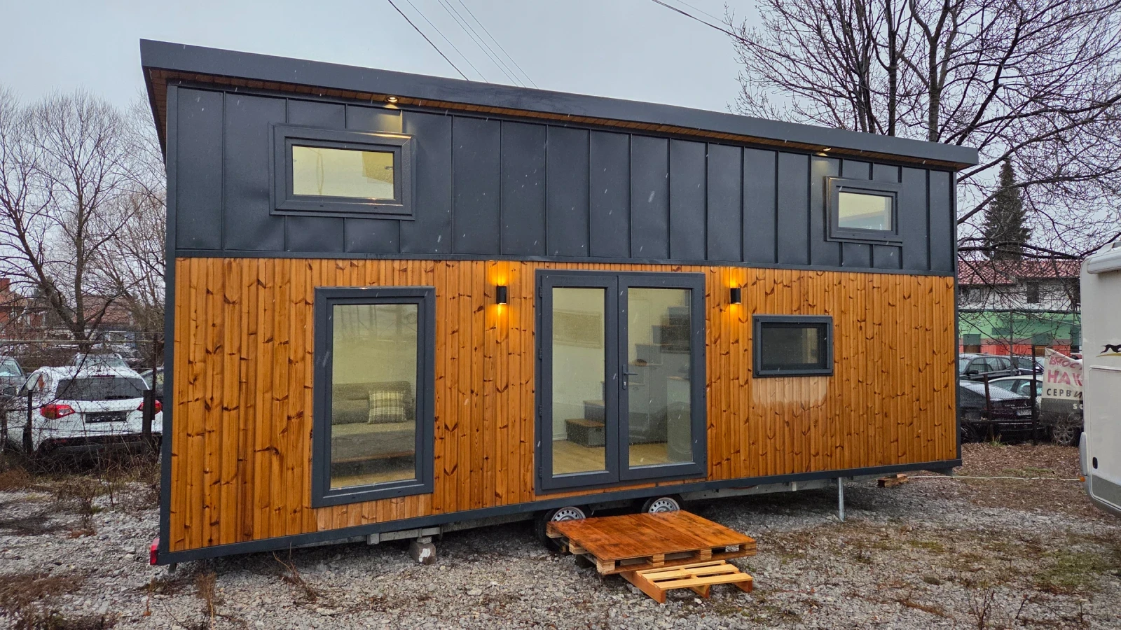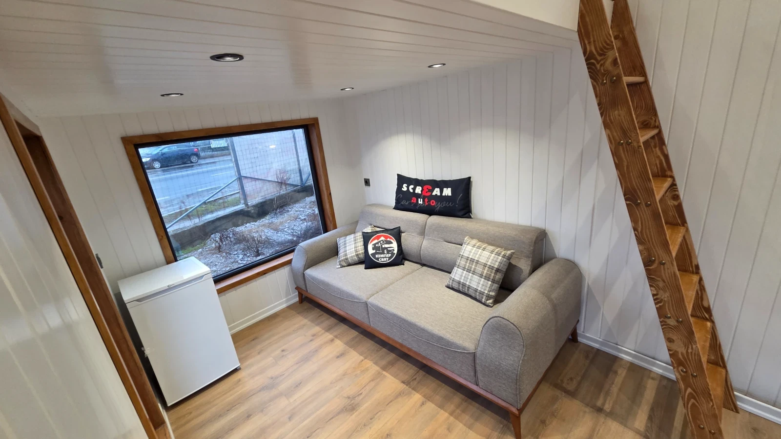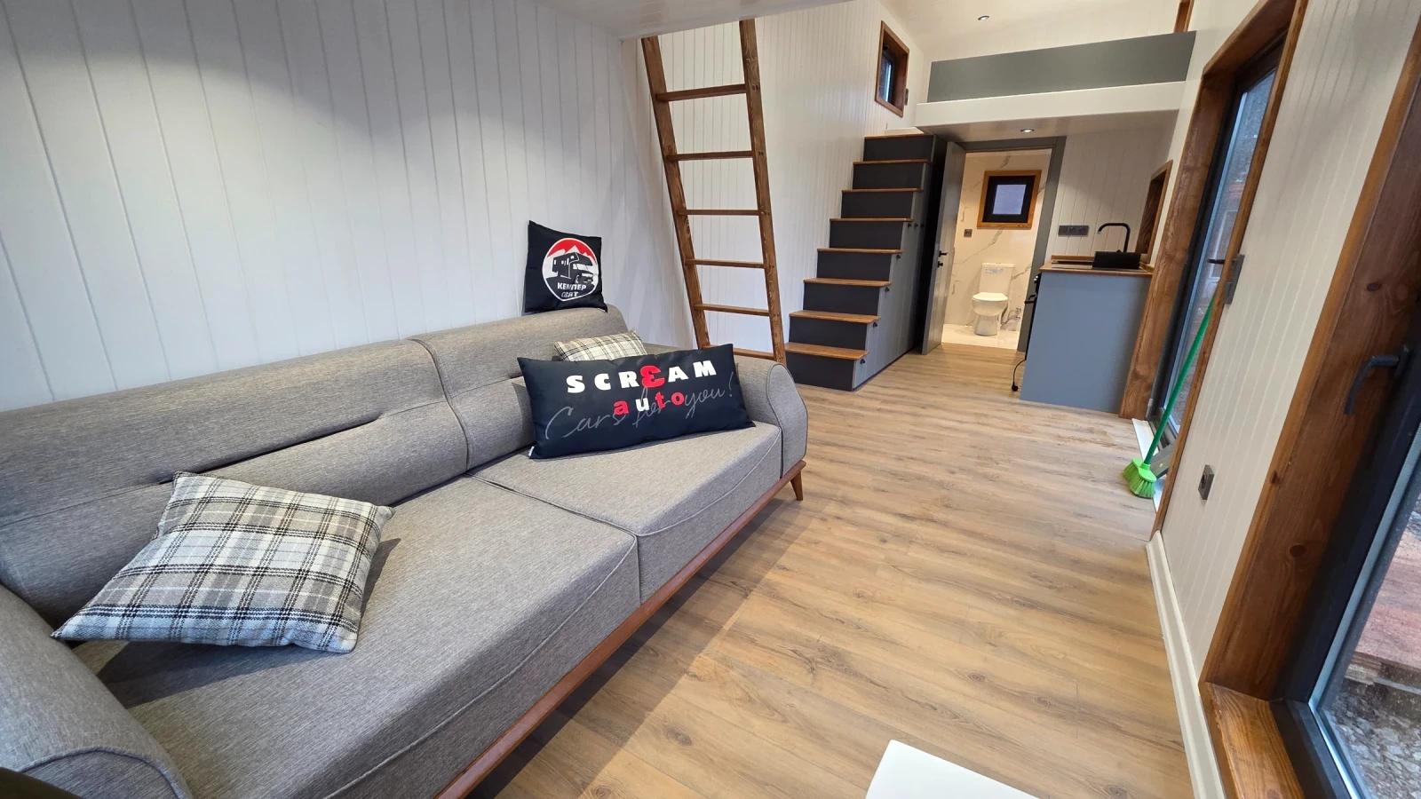 Кемпер Свят Мобилни къщи на колела Представяме мобилна къща, изградена върху шаси със статут на каравана практично решение за терени, при които стандартното строителство е затруднено или изисква разрешителен режим. Дом, който може да бъде преместен при необходимост. Гъвкавост, сигурност и функционалност в едно решение. Размери: Дължина на модула: 7, 99 м Теглич: 1, 30 м Ширина: 2, 50 м Височина: 4, 00 м Разпределение модел SCREAM Просторна дневна зона Кухня с трапезария Баня с тоалетна Две спални на второ ниво Комфортен хол с оптимална височина Конструкция и оборудване: Скелет от 0, 80 мм U-профили от горещо поцинкована стомана 10 см каменна вата за отлична топло- и шумоизолация Външно покритие Thermawood Ос 2000 кг със спирачна система Пожароустойчиви тръби и електроинсталация Ламинатна подова настилка Лакови интериорни врати Мембранни шкафове Международен сертификат 02 Мобилната къща може да бъде теглена от джип или бус с необходимата теглителна способност. Пълна автономност при необходимост Кемпер Свят предлага възможност за изграждане на напълно автономна система според нуждите на клиента подходяща за терени без електрозахранване и инфраструктура. Възможно е оборудване със соларна система, акумулаторен блок, инвертор, система за вода и отопление, така че къщата да функционира независимо от външни източници. МОЖЕ И НА ЛИЗИНГ! !! !! !! !! !! !