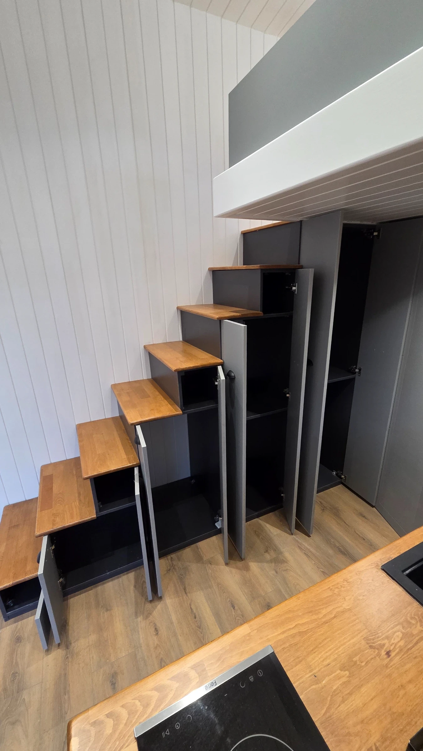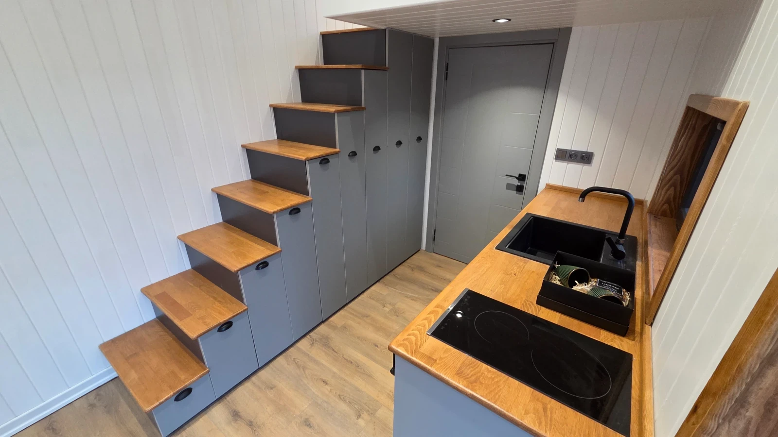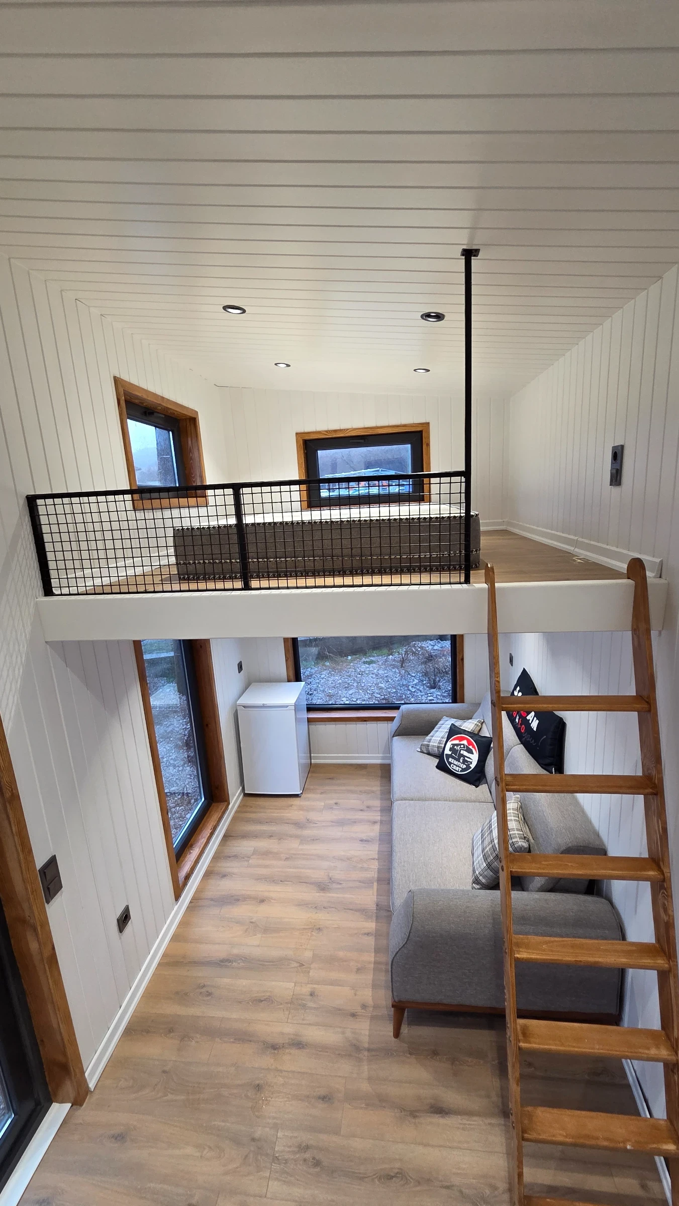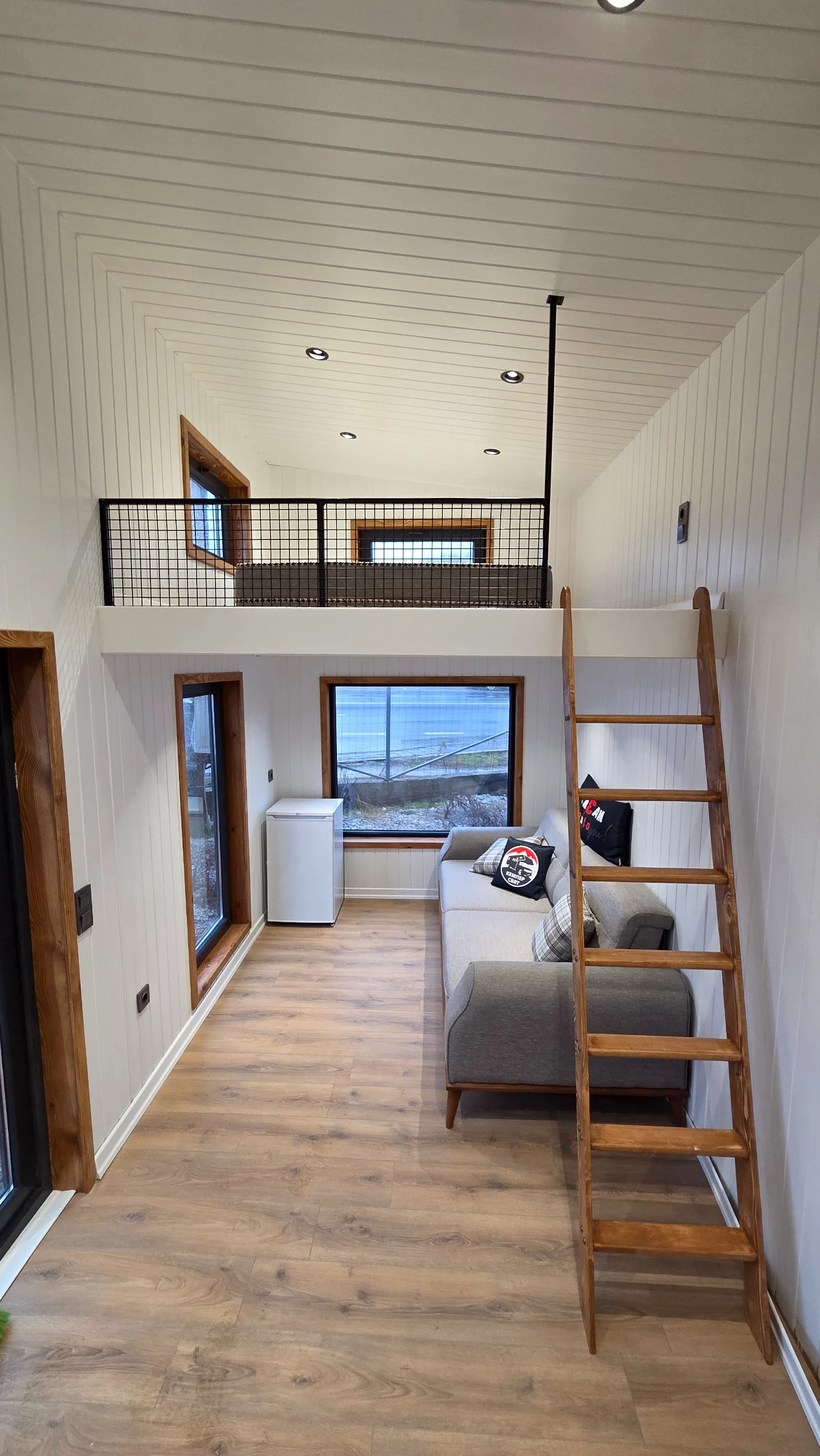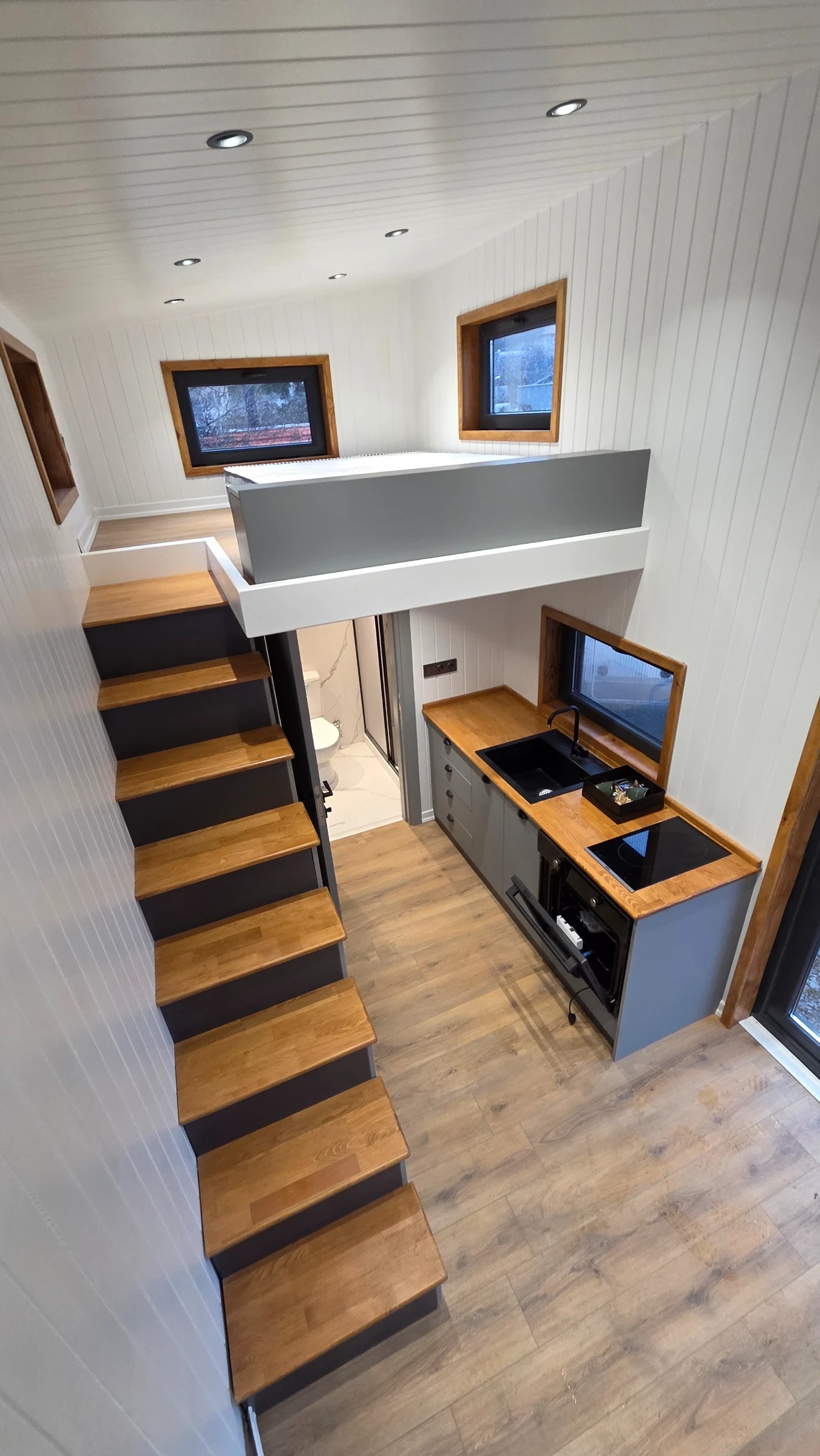 Кемпер Свят Мобилни къщи на колела Представяме мобилна къща, изградена върху шаси със статут на каравана практично решение за терени, при които стандартното строителство е затруднено или изисква разрешителен режим. Дом, който може да бъде преместен при необходимост. Гъвкавост, сигурност и функционалност в едно решение. Размери: Дължина на модула: 7, 99 м Теглич: 1, 30 м Ширина: 2, 50 м Височина: 4, 00 м Разпределение модел SCREAM Просторна дневна зона Кухня с трапезария Баня с тоалетна Две спални на второ ниво Комфортен хол с оптимална височина Конструкция и оборудване: Скелет от 0, 80 мм U-профили от горещо поцинкована стомана 10 см каменна вата за отлична топло- и шумоизолация Външно покритие Thermawood Ос 2000 кг със спирачна система Пожароустойчиви тръби и електроинсталация Ламинатна подова настилка Лакови интериорни врати Мембранни шкафове Международен сертификат 02 Мобилната къща може да бъде теглена от джип или бус с необходимата теглителна способност. Пълна автономност при необходимост Кемпер Свят предлага възможност за изграждане на напълно автономна система според нуждите на клиента подходяща за терени без електрозахранване и инфраструктура. Възможно е оборудване със соларна система, акумулаторен блок, инвертор, система за вода и отопление, така че къщата да функционира независимо от външни източници. МОЖЕ И НА ЛИЗИНГ! !! !! !! !! !! !