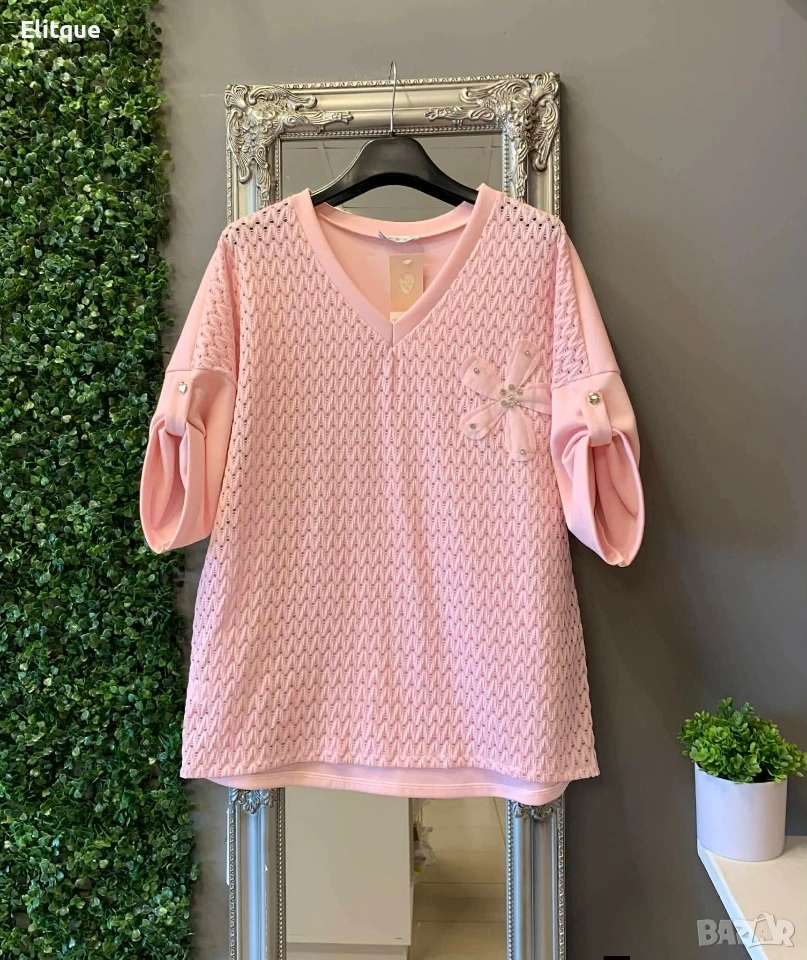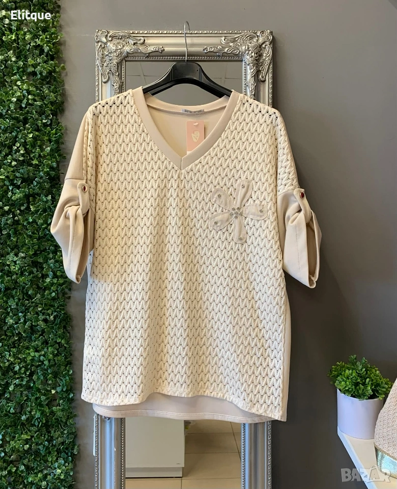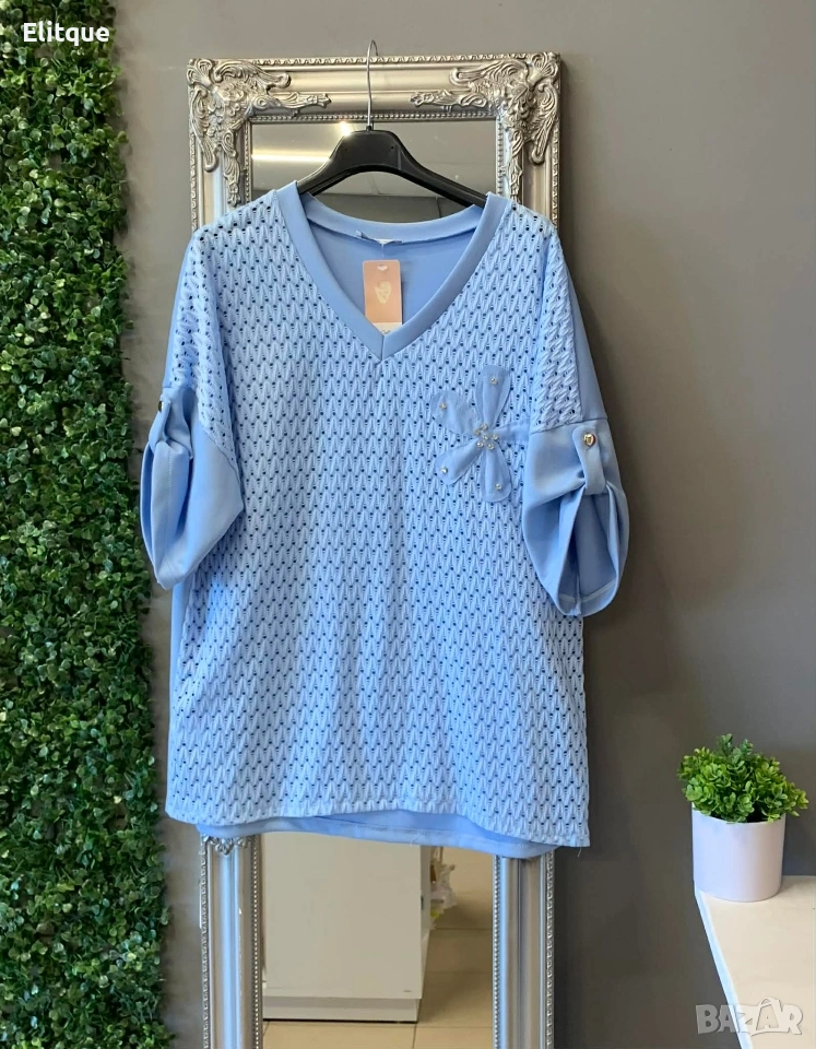💕 🦋НОВО 🦋💕 🌸Ефирна дамска блуза с деликатна мрежеста материя в предната част и стилен декоративен акцент – перфектният избор за свежа и женствена визия. 💖 🪡Стандартен размер,от Л до 2ХЛ подходящ за гр. обиколка до 120см. ✔️25€