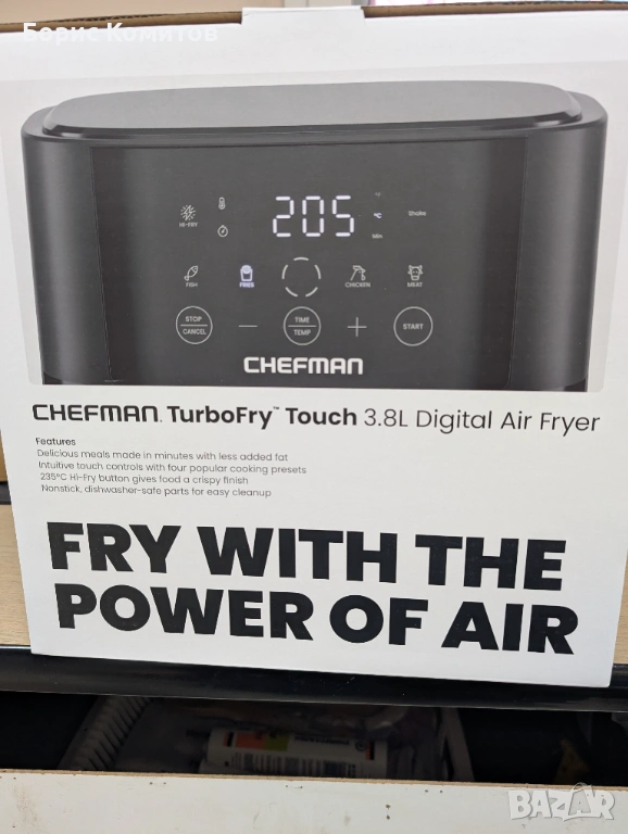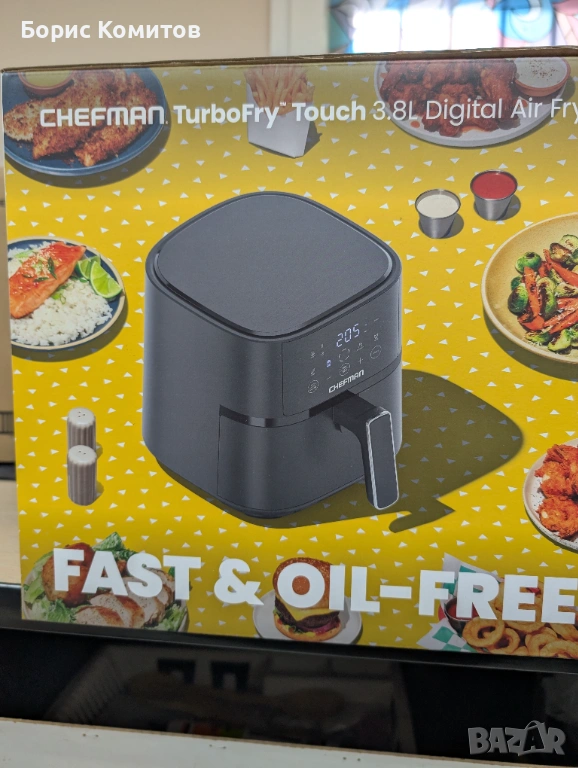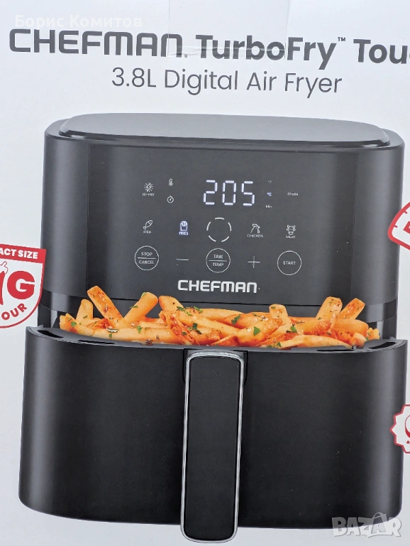 Фритюрник с горещ въздух Chefman 3.8L, бърз и лесен, компактен фритюрник с горещ въздух с технология Hi-Fry, сензорно управление с 4 предварително зададени настройки, незалепващо покритие и подходящ за съдомиялна машина - черен .