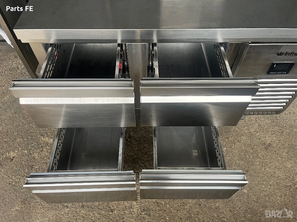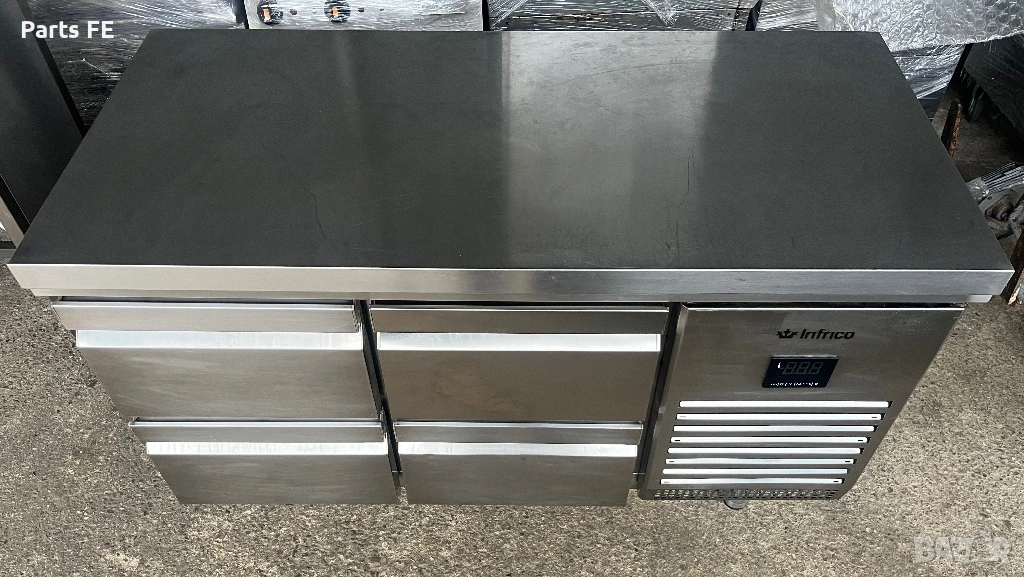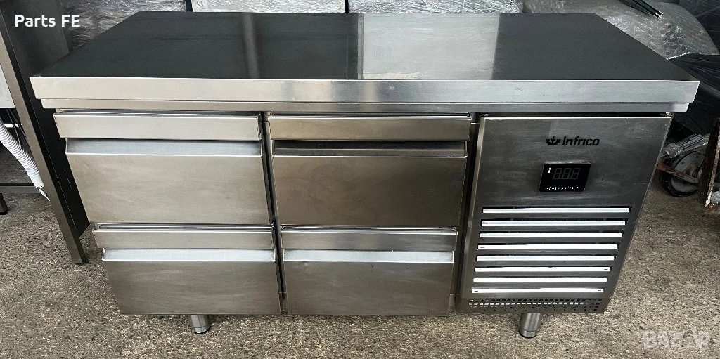 Професионална хладилна маса с 4 чекмеджета “Infrico”. Монофазен уред с мощност 400W. Размери: В84см, Ш147см, Д70см. Размера на чекмеджетата е за 1/1 ГН. Ревизиран и профилактиран уред, готов за употреба. Имам и други професионални уреди за ресторанти и заведения. За повече информация моля позвънете.