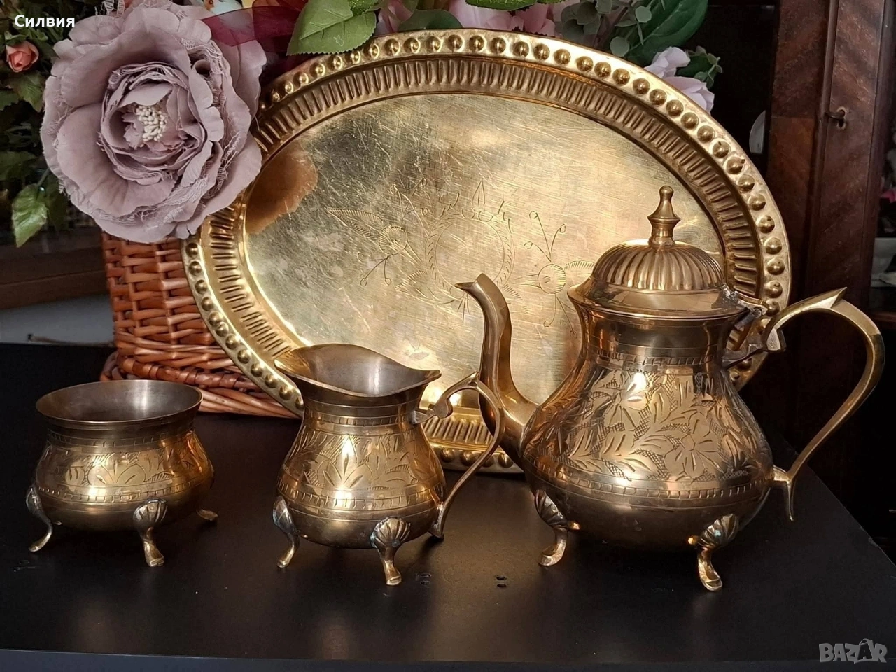 Винтидж, комплект от 4 части: Овален поднос, Чайник/кафеник, Каничка-сметана захарница- всичко с ръчна гравюра и изящна орнаментика. От масивен златист месинг, гравирани и хубави крачета за стоене. Красив комплект с изразена ориенталска естетика, с богата флорална украса и елегантни извити крачета, които придават усещане за изтънченост и класа. Подносът е с релефен борд и фин флорален мотив в центъра. 🔸 Материал: масивен златист месинг 🔸 Стил: ориенталски / ретро / винтидж 🔸 Ръчна изработка и гравюра 🔸 Подходящ за декорация, подарък или колекция. Сервизът е в много добро състояние за възрастта си – с естествена патина, която подчертава автентичността му. Чудесен акцент за интериор в стил бохо, класически или еклектичен. ೋ🌷 ೋ🌷 ೋ🌷