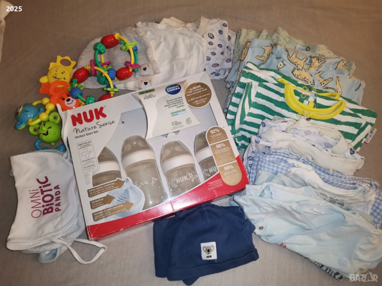 Бебешки дрешки, играчки и принадлежности за момчета близнаци.