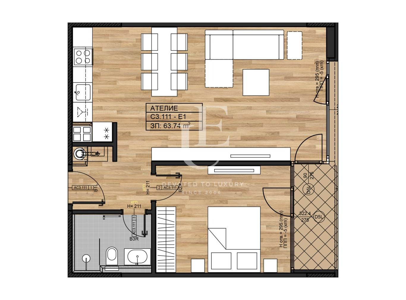 Разположен на четвърти етаж, имотът предлага изключително просторна и светла жилищна среда с чиста площ от 199.48 кв.м и отлична височина на таваните. Френските прозорци от пода до тавана разкриват усещане за въздух, свобода и панорамни гледки. Многостранното изложение югоизток, северозапад и североизток гарантира естествена светлина през целия ден и балансиран микроклимат.