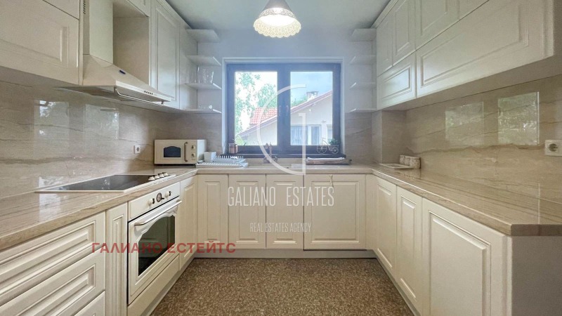 Кухнята е оборудвана с чисто нови електроуреди и плот от естествен камък. За максимална сигурност имотът разполага с видеонаблюдение, СОТ система и допълнително укрепена дограма.