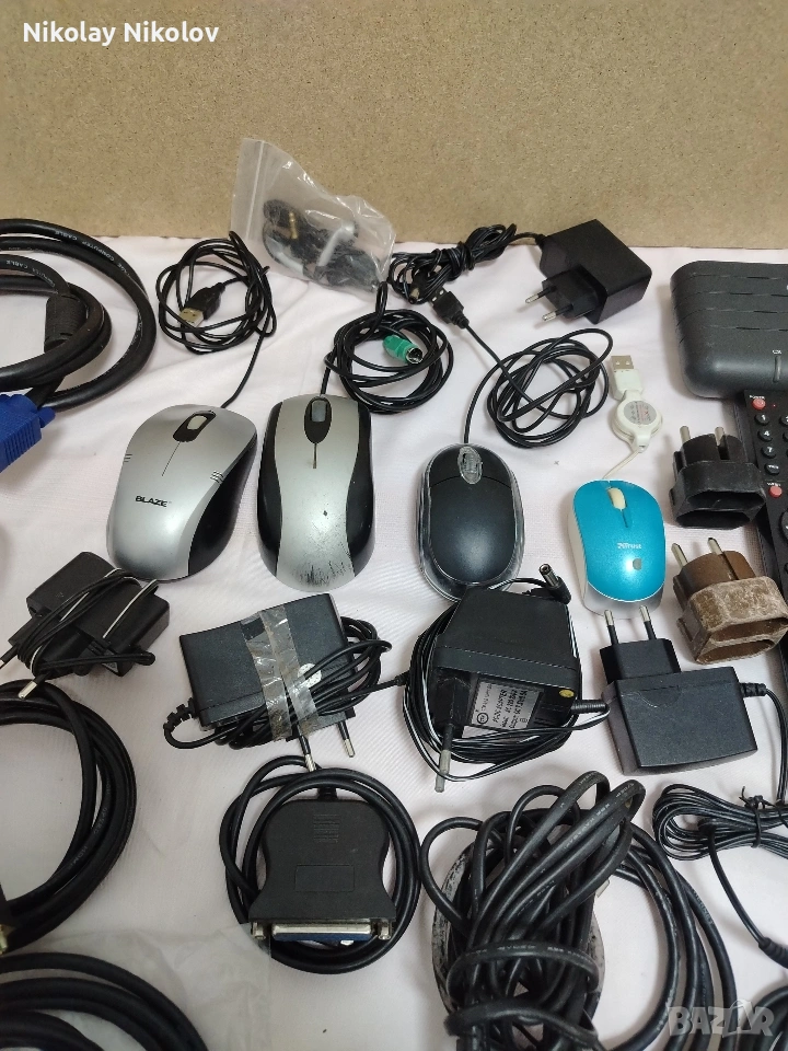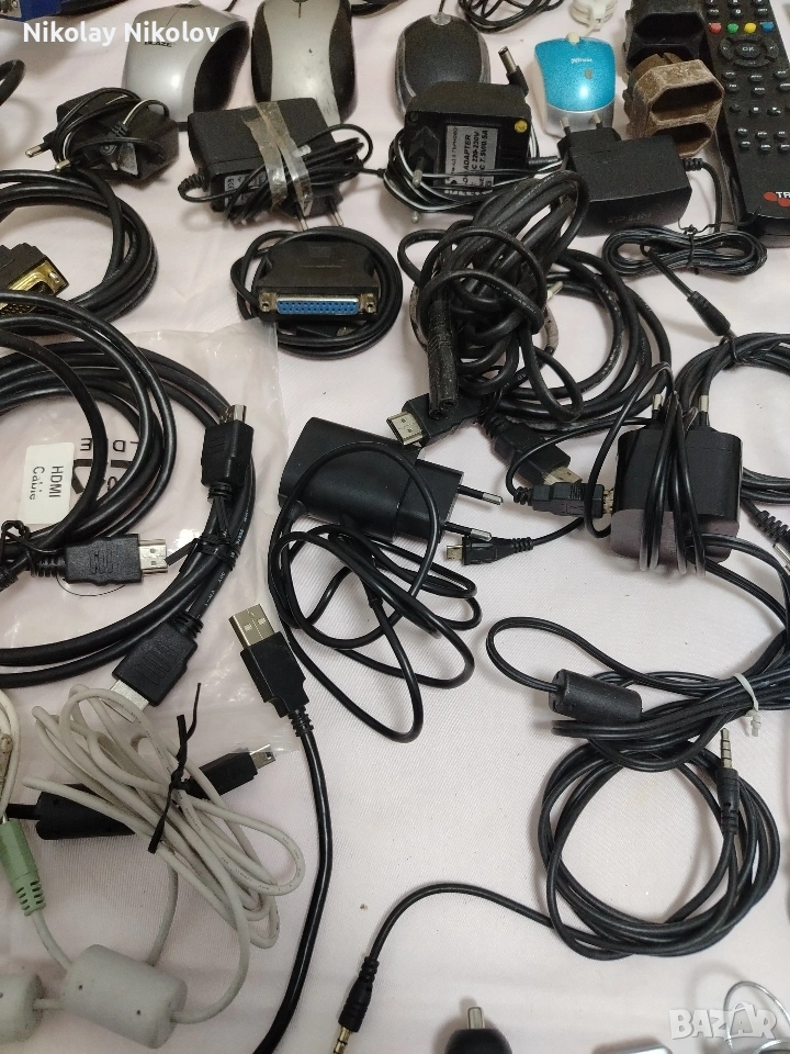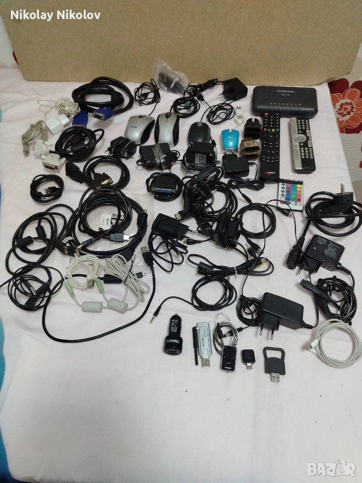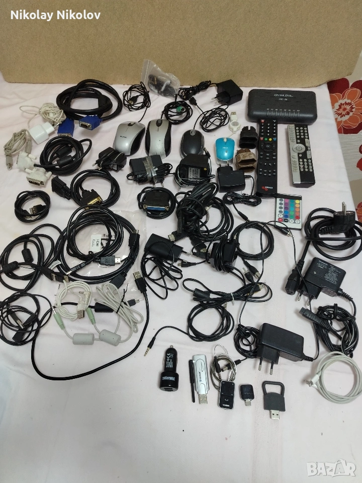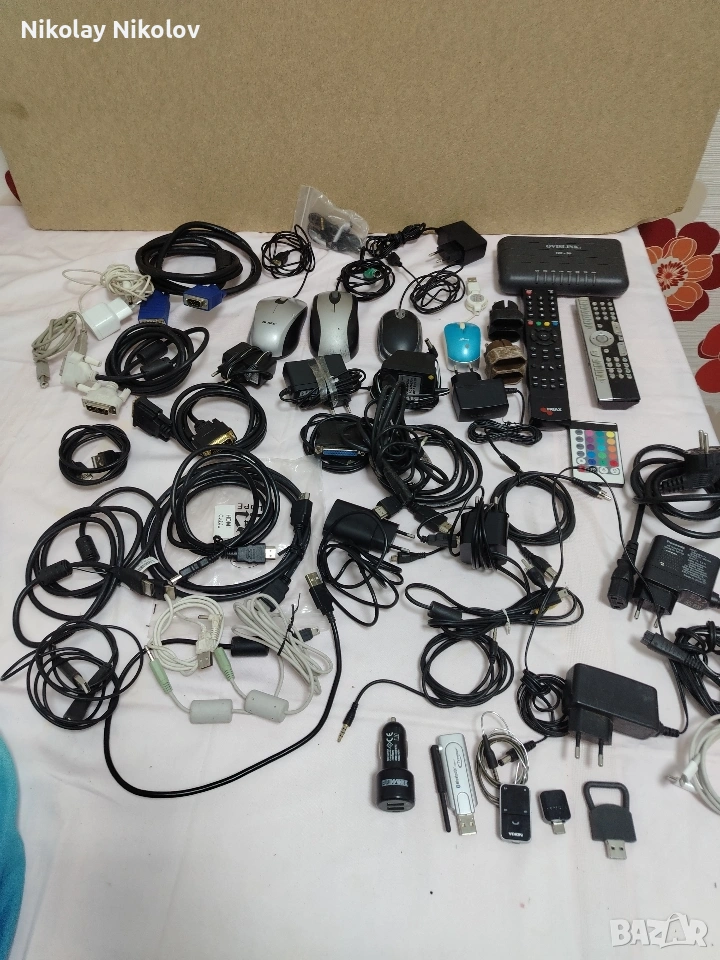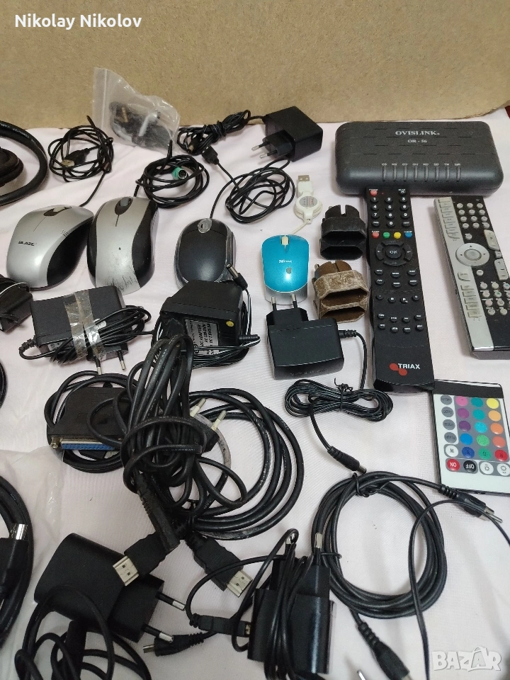 58 броя зарядни,адаптери,HD кабели чисто нови около 5 броя приемник, дистанционно управление 3бр флашки, мишки и други неща всичко работи
