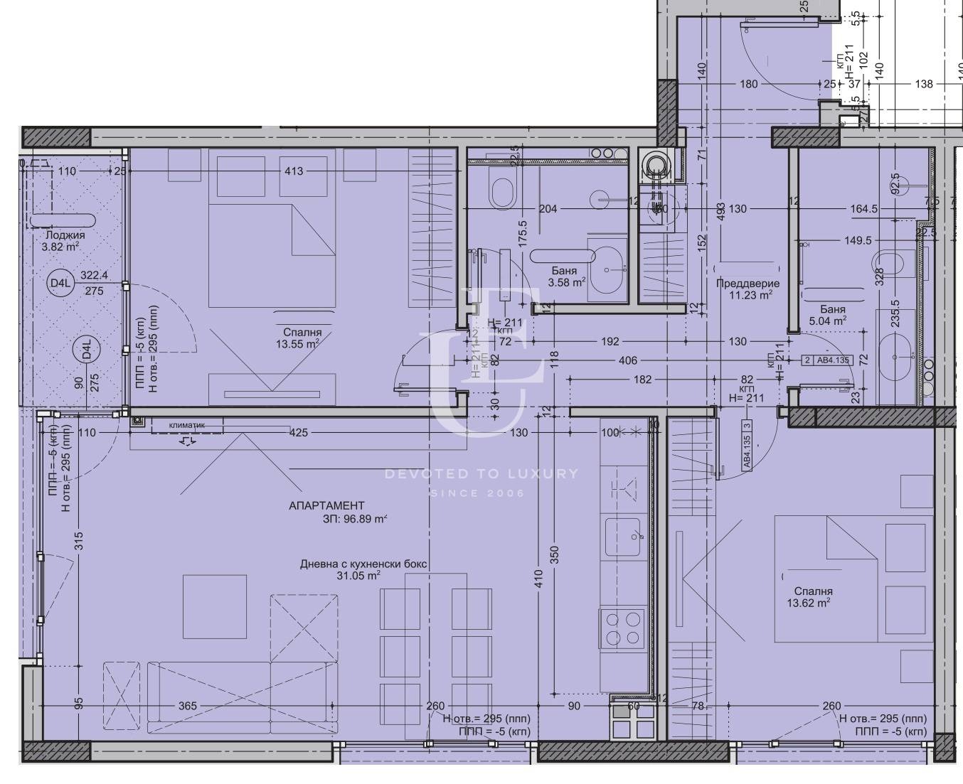 Разпределението на имот включва хол с кухненски бокс, две спални, две бани с тоалетни и тераса Цената е без включен ДДС. Ref. ID:25678