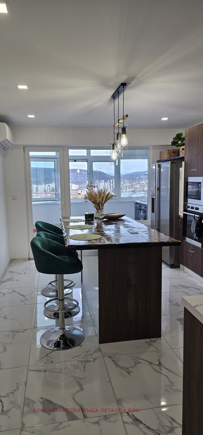 Голям прозорец с немска четирисезонна дограма, от който се вижда целият град. Това не е светло помещение това е панорама.