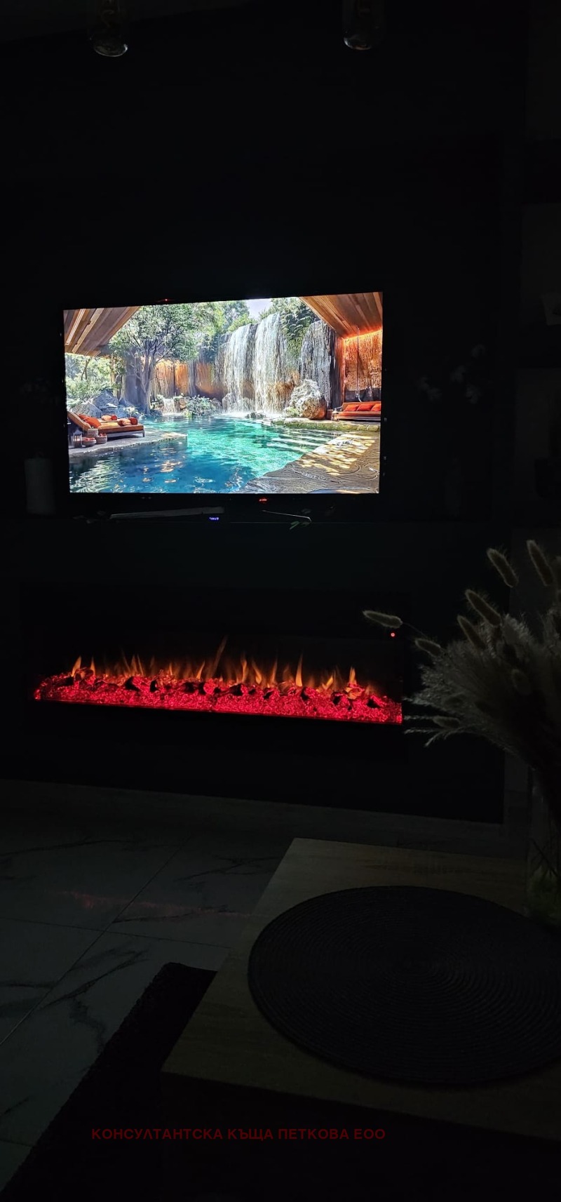 Електрическа камина, вградена в дизайнерска зелена акцентна стена.