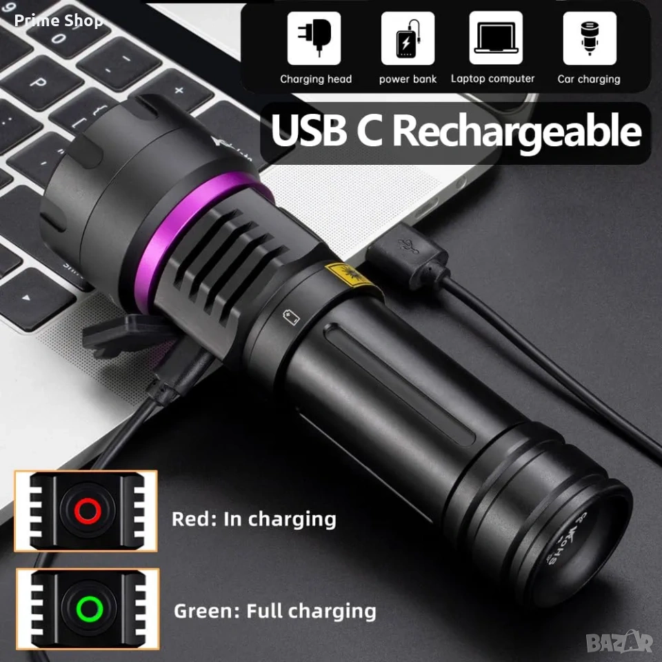 * Интелигентно USB-C зареждане: Фенерът разполага с модерен Type-C порт и LED индикатор за състоянието на батерията (червен цвят при зареждане, зелен при пълен заряд).