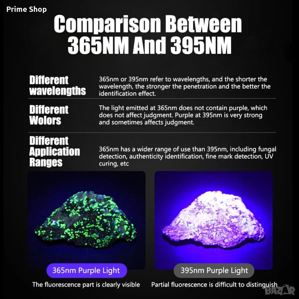 * Оптимизиран 365nm спектър: За разлика от стандартните 395nm алтернативи, дължината на вълната от 365 nm осигурява значително по-дълбоко проникване и по-висок контраст на флуоресценцията, елиминирайки смущаващите видими лилави отблясъци.